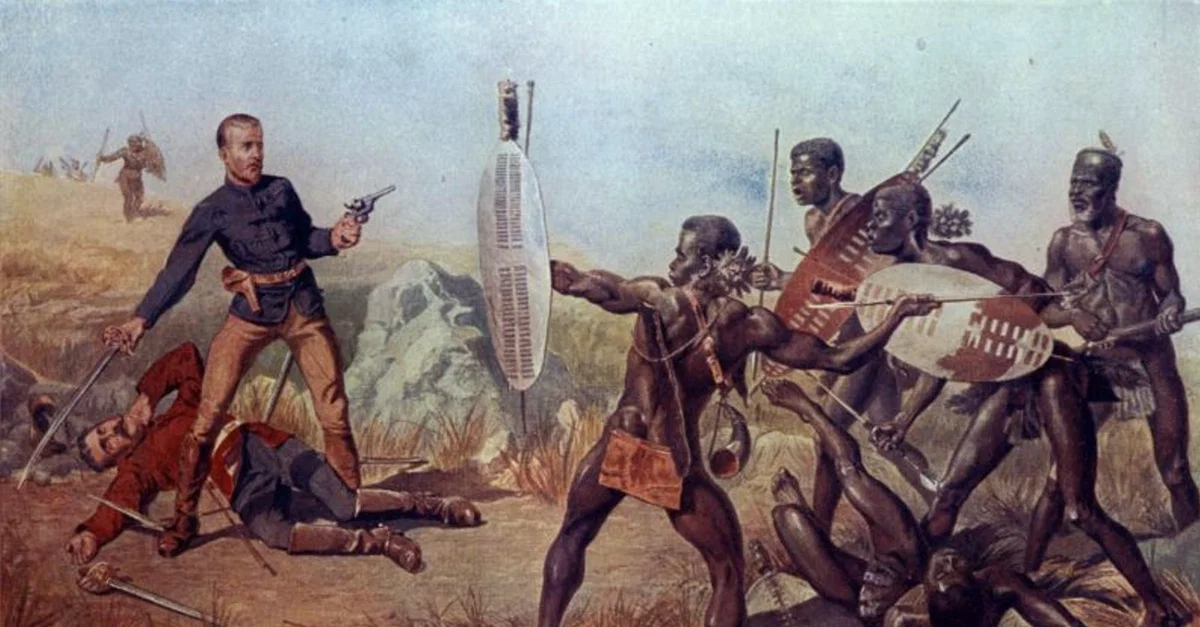 An illustration by Charles Edwin Fripp showing the last stand of Lieutenants T. Melville and N.J.A. Coghill during the battle of Isandlwana in the Anglo-Zulu War of 1879. The two men tried to save the Queen’s Colour of the 1/24th Regiment, but both died in the attempt. The colours fell into a river and were washed away but were later recovered by the British.