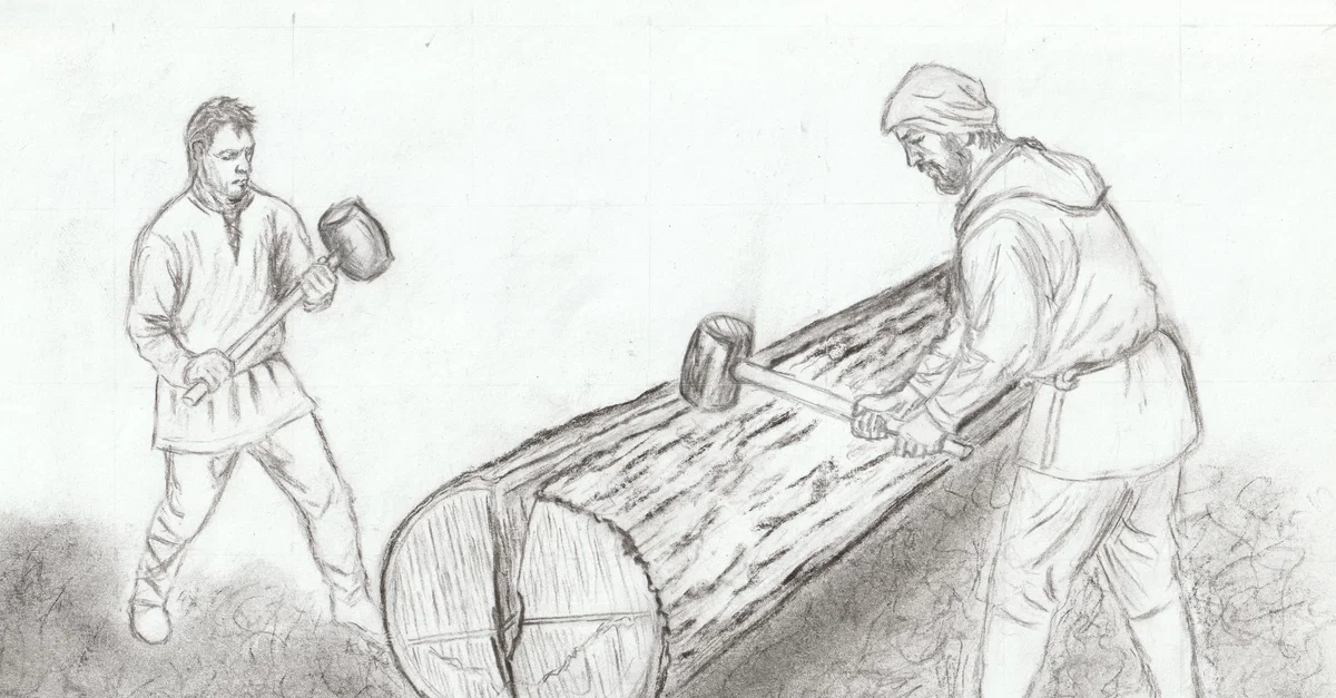 In the Viking timber yard, large logs were split from the root end. Small wedges first opened a line, then larger wedges and mallet blows drove the split deeper, and the wood followed its natural grain as it opened.