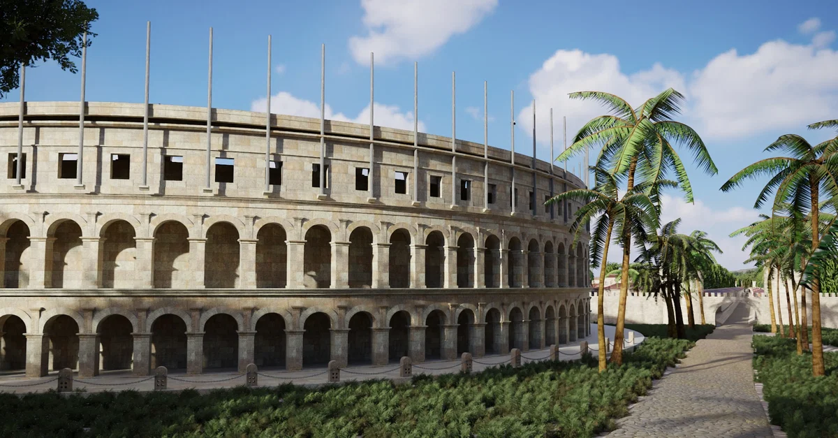 As Caesarea Maritima was a center of sporting events in the Mediterranean world, Herod the Great assigned this building to host games every five years, which likely included wrestling, boxing matches, gymnastic events, and possibly gladiatorial spectacles. As was common practice among the Romans, using the Capua amphitheater in Italy as a plausible parallel, this stadium was likely located outside the main gate of the Cardo Maximus at its southern end, where the greatest amount of commercial traffic from the East arrived at the city. To give an idea of the possible scale of the amphitheater by way of a parallel, the amphitheater at Capua had an axis of 170 meters (560 ft) and a total façade height of 46 meters (151 ft).