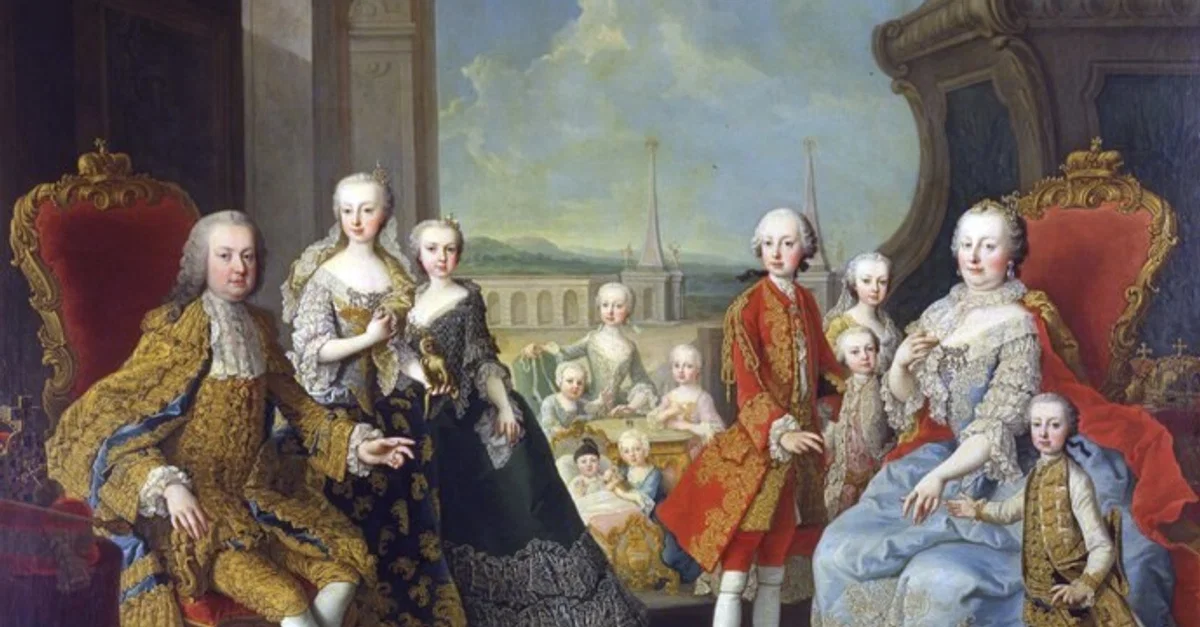 Those depicted include Maria Theresa (right, seated) her husband Francis I (left, seated), a young Joseph II (center, standing next to his mother), and the many other Habsburg children. Absent is Maria Theresa's most famous daughter Marie Antoinette, who was not yet born.