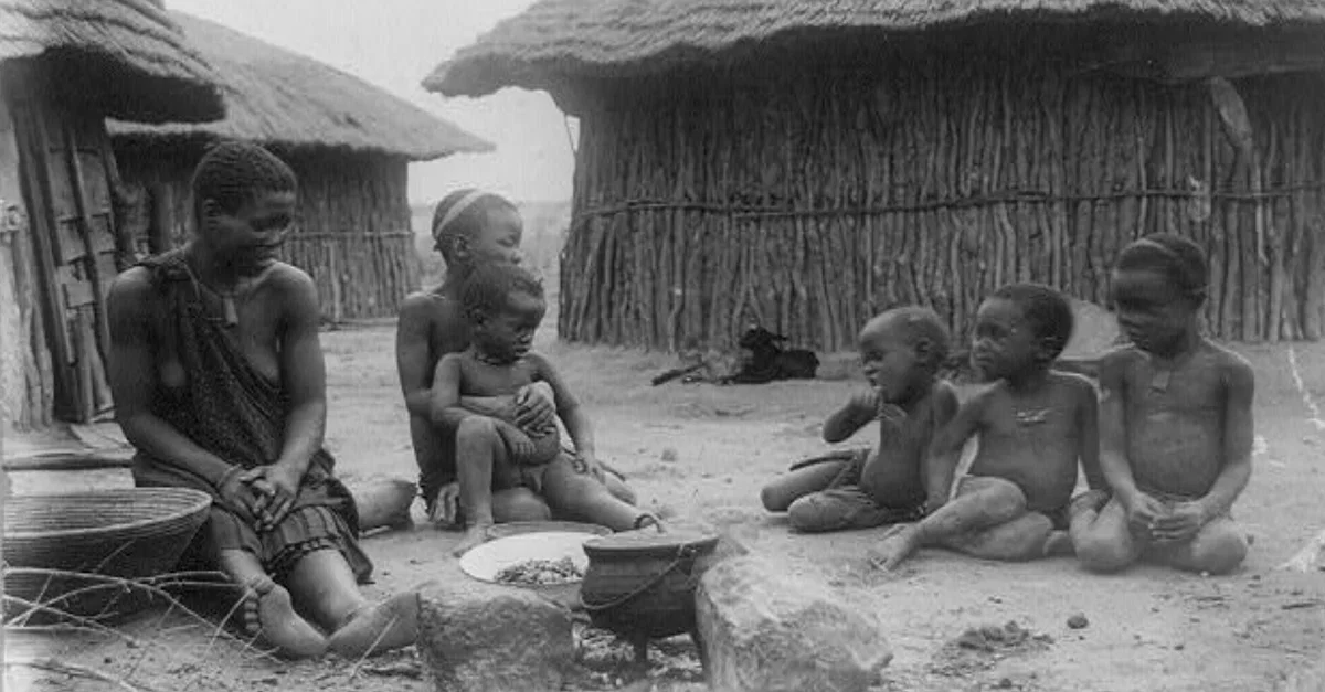 A photograph dating to the late-19th or early-20th century showing Ndebele women and children and traditional huts at Bulawayo, once the capital of Matabeleland.