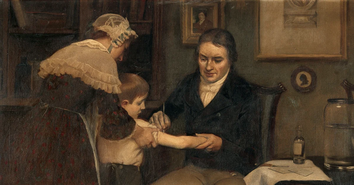 A c. 1910 painting by Ernest Board showing the English physician Edward Jenner (1749-1823), the vaccine pioneer, administering a vaccination against cowpox to James Phipps in 1796, which subsequently protected him from contracting smallpox.