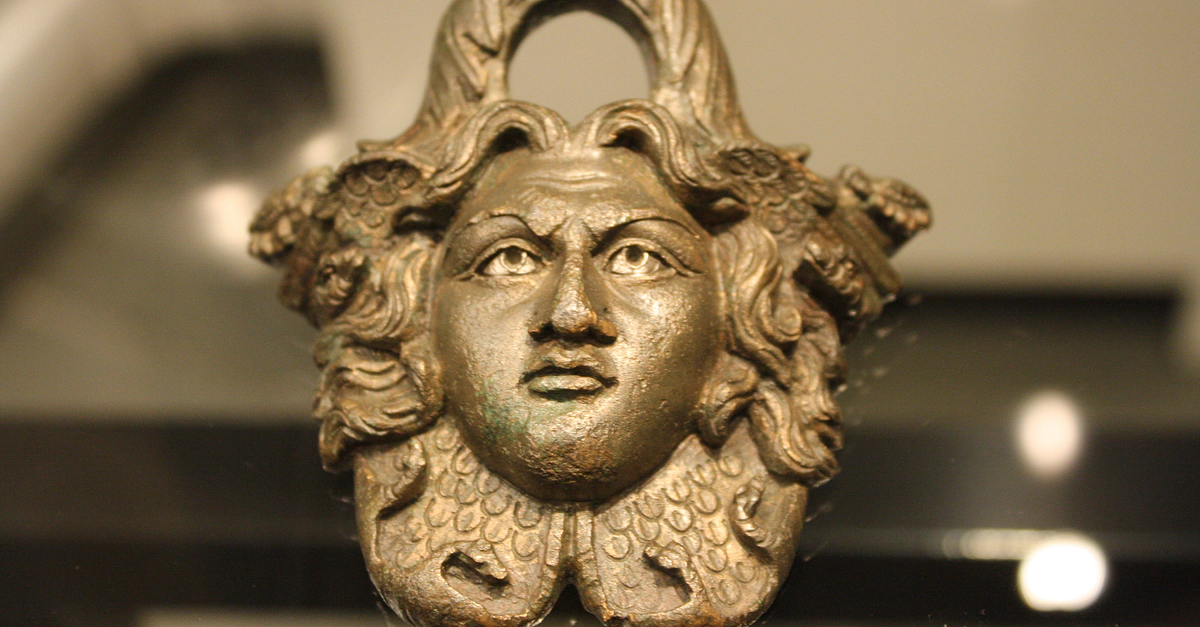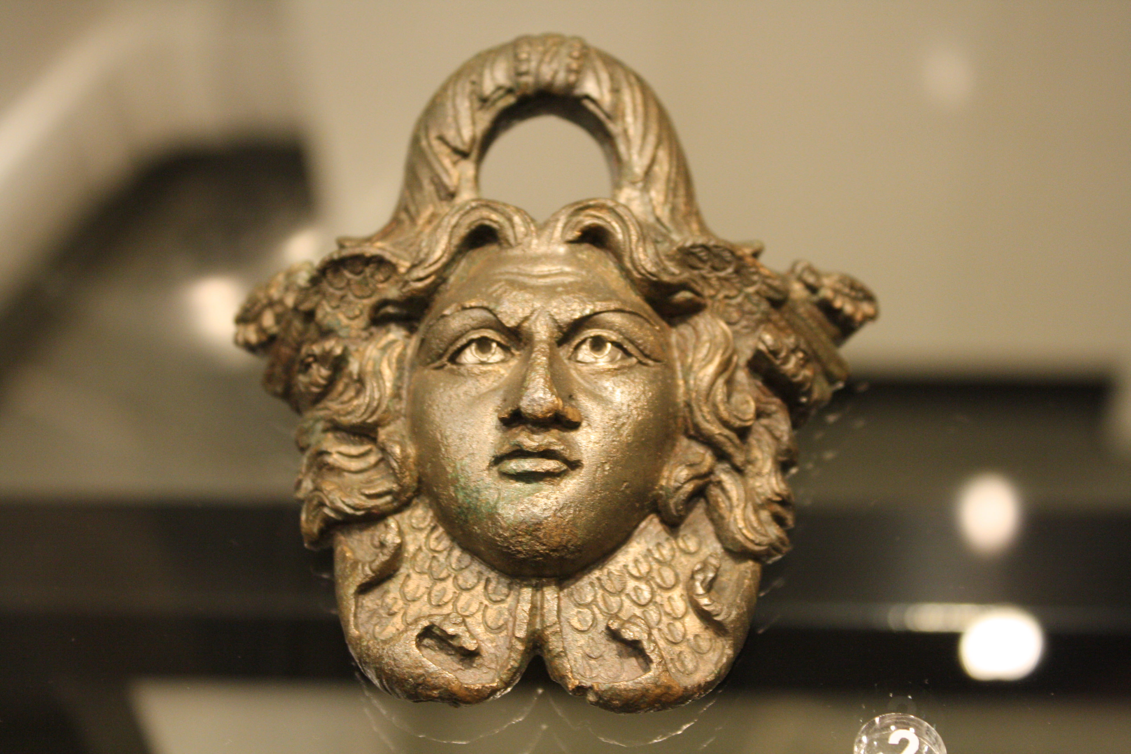 A Roman bronze bucket handle in the form of Medusa. Date unknown. Excavated from the theatre of Aosta, northern Italy. (Archaeological Museum, Aosta)
