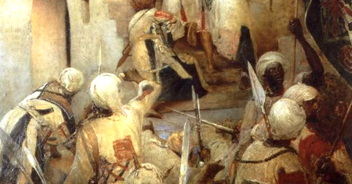 An 1893 painting by George W. Joy titled General Gordon's Last Stand. Gordon was killed in 1885 by Mahdists at the end of the siege of Khartoum during the Mahdist War in Sudan.