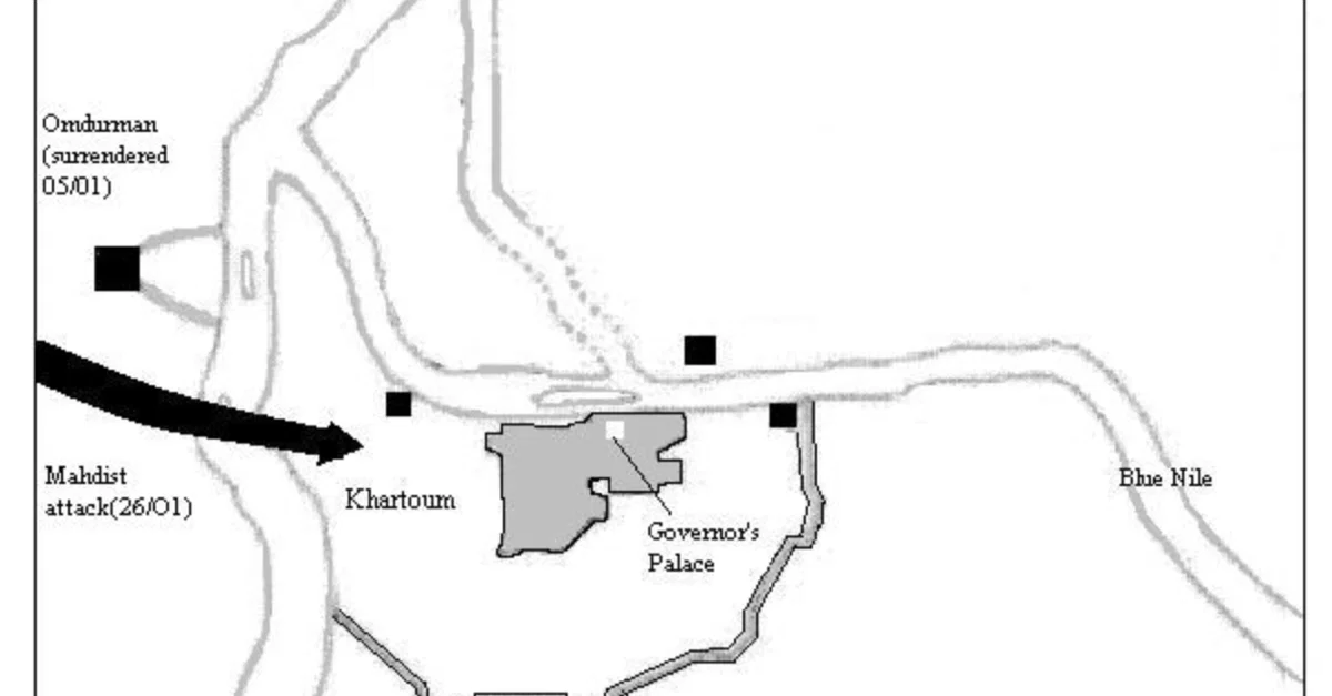 A map showing the natural and manmade defences of Khartoum during the siege of Khartoum in 1884-5 during the Mahdist War (1881-99).