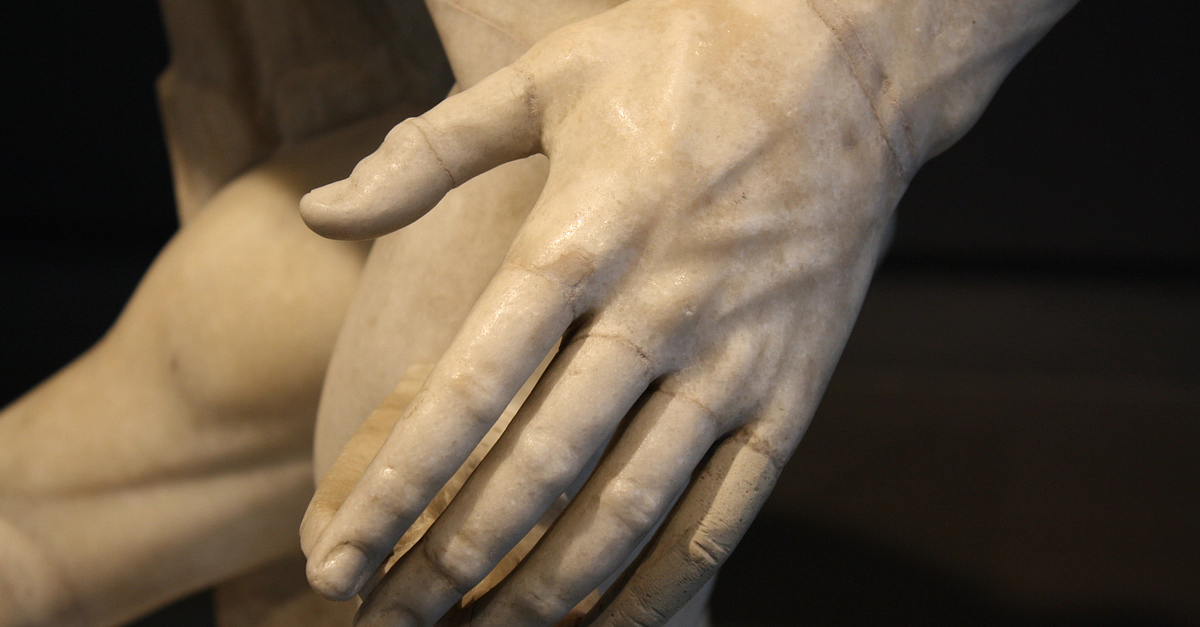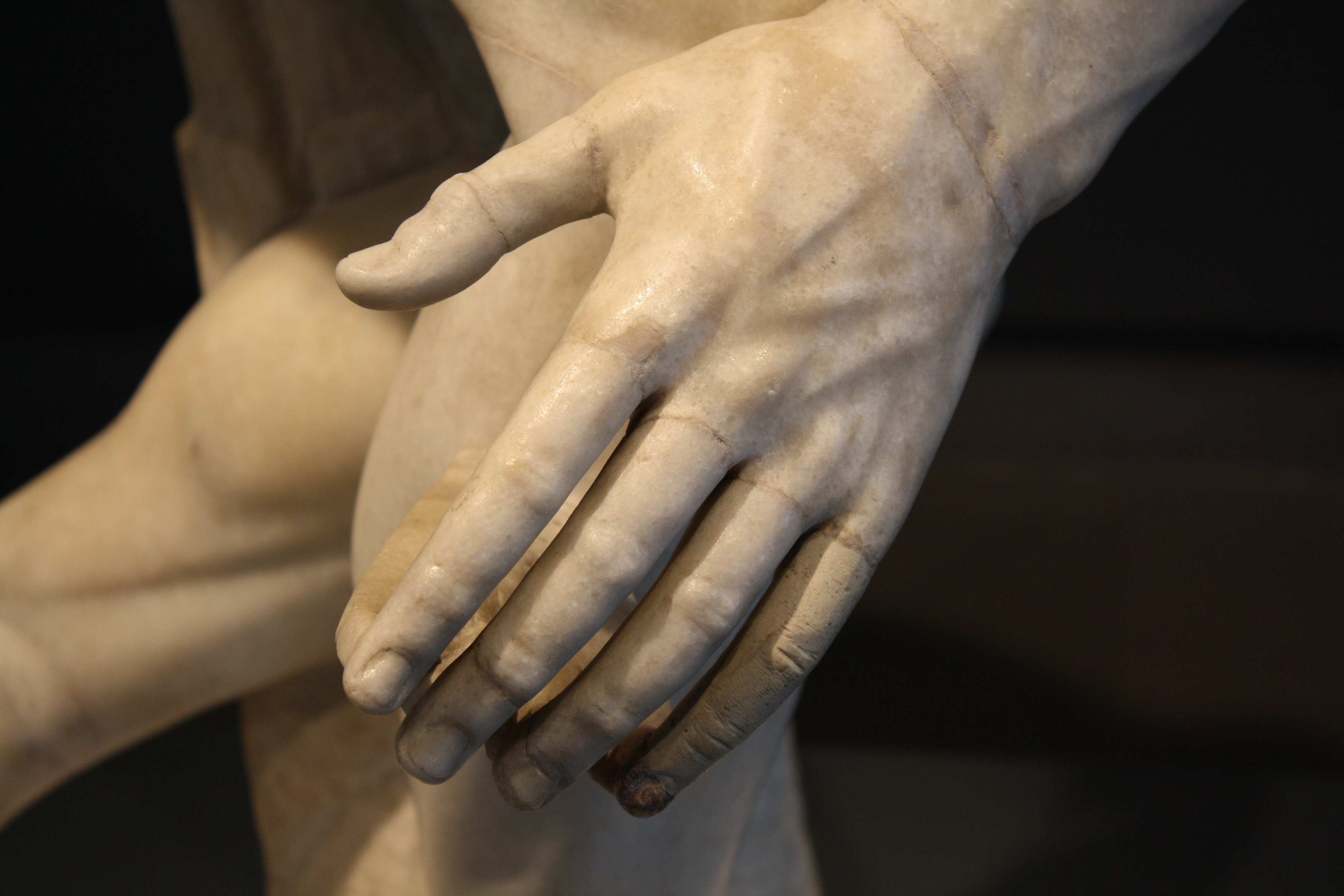 A detail of the Discobolus Lancellotti in Parian marble. This is the most complete example from antiquity of the discobolus type statue, all of which were based on an original Greek bronze of c. 450 BCE by Myron. This example dates to the 2nd century CE. (Palazzo Massimo, Rome)