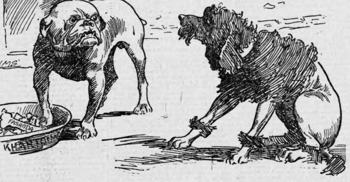 A cartoon by J.M. Staniforth of the Fashoda Incident of 1898 when France and Britain almost went to war over their competing claims for control of the Upper Nile.