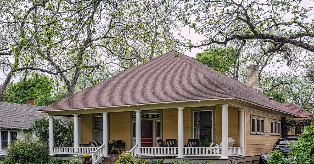 A photograph of a colonial-inspired bungalow in Austin, Texas. The bungalow was constructed in 1911 for May Brownlee, the widow of Dr. John Samuel Brownlee.