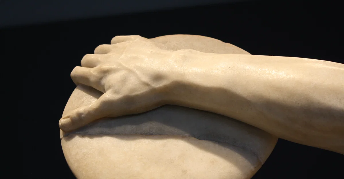 A detail of the Discobolus Lancellotti in Parian marble. This is the most complete example from antiquity of the discobolus type statue, all of which were based on an original Greek bronze of c. 450 BCE by Myron. This example dates to the 2nd century CE. (Palazzo Massimo, Rome)