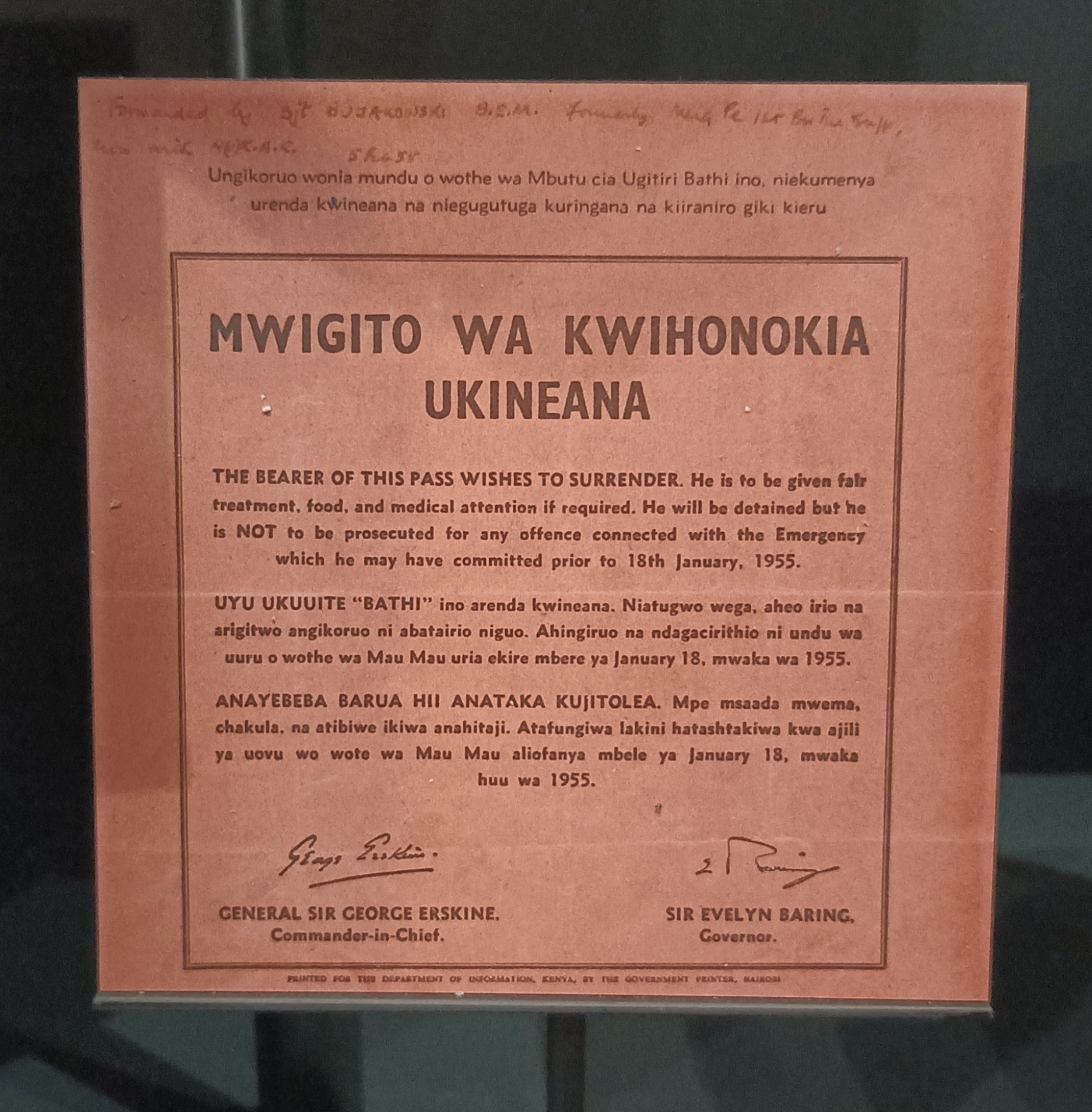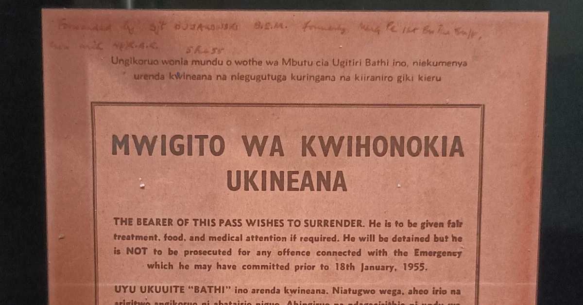 A safe conduct pass dropped in rebel areas of British Kenya to encourage members of the Mau Mau rebellion (1952-60) to give themselves up to the authorities.
