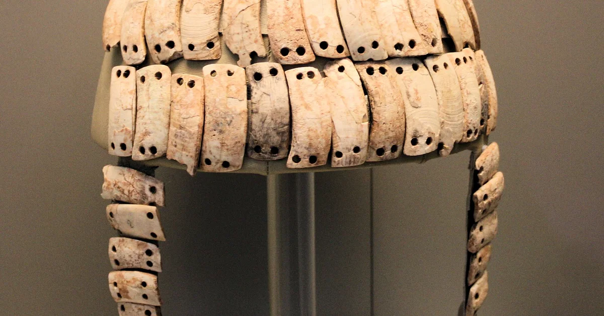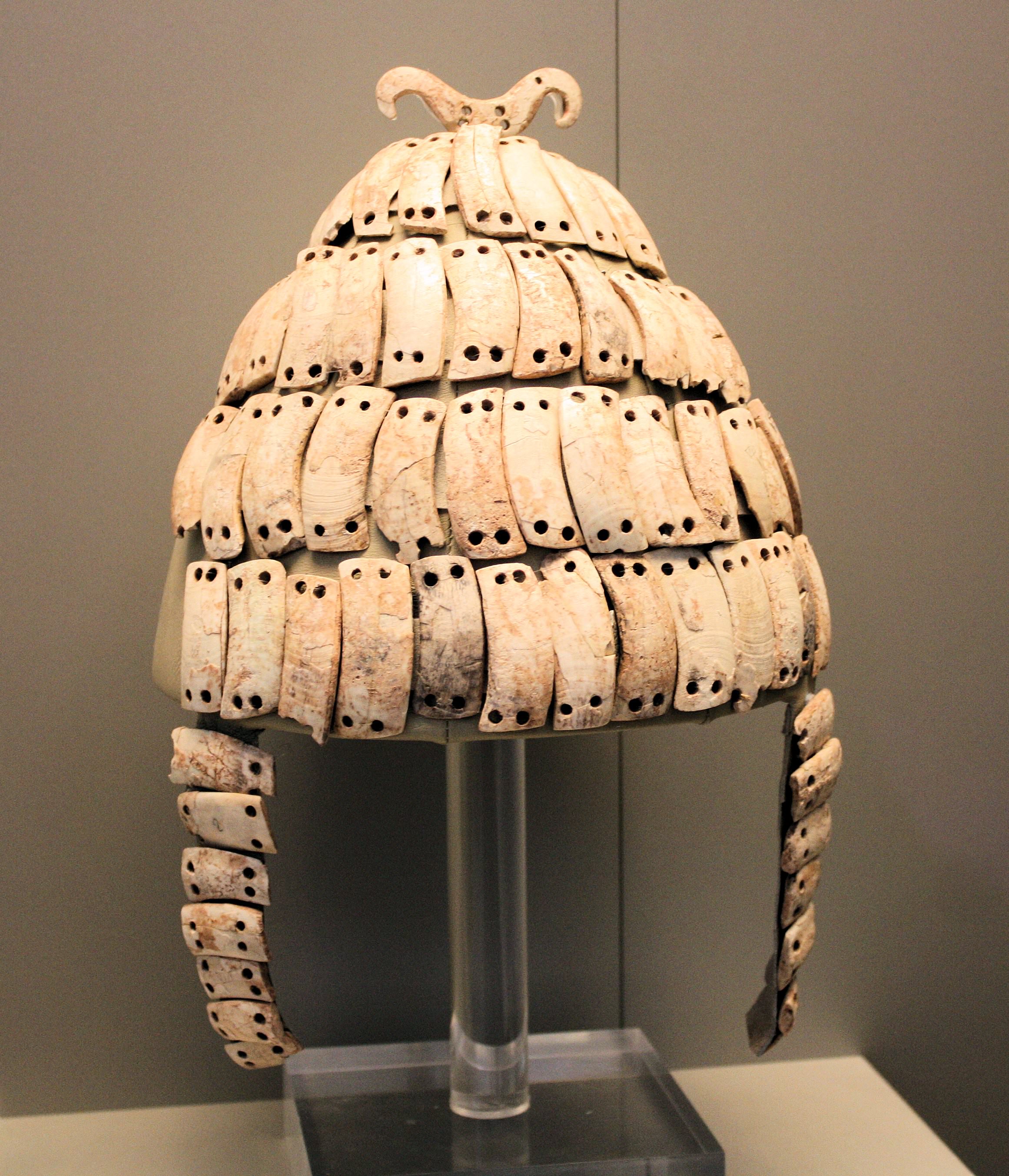 Mycenaean boar's tusk helmet excavated from chamber tomb 515. A description of this type of helmet can be found in Homer's 'Iliad'. 14th - 13th cents. BCE. Currently housed at the National Archaeological Museum of Athens.