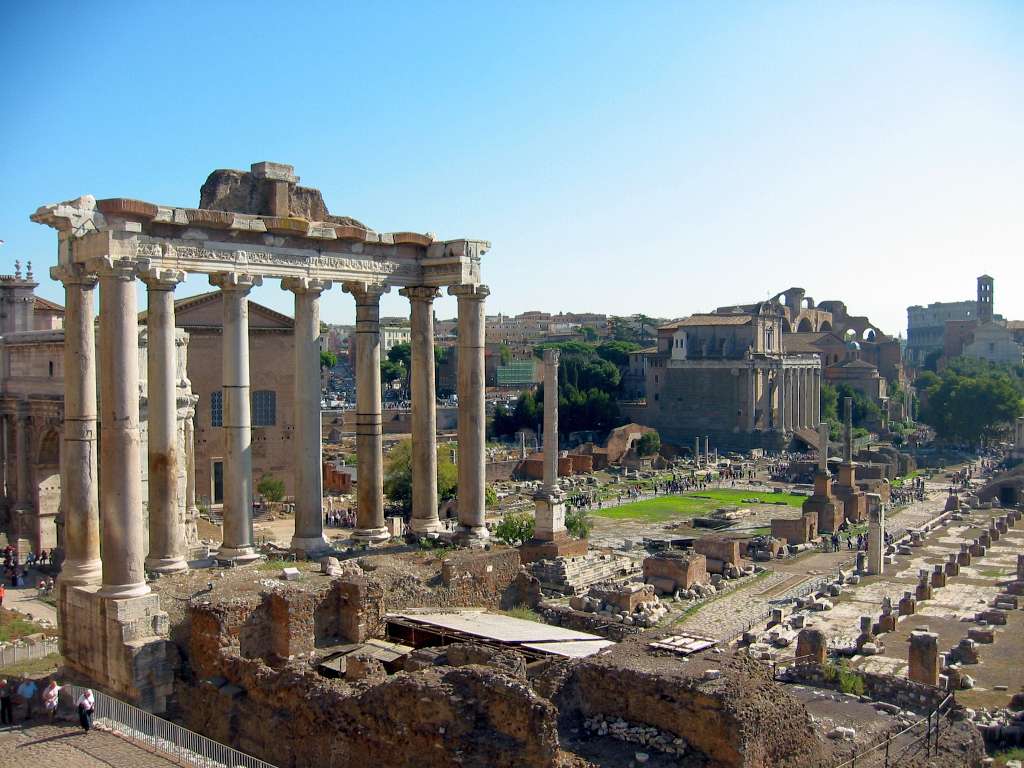 The Temple of Saturn in the Roman Forum. Once housing a cult statue of Saturn, it was the focal point of the annual Saturnalia celebrations every December and housed Rome's treasury.