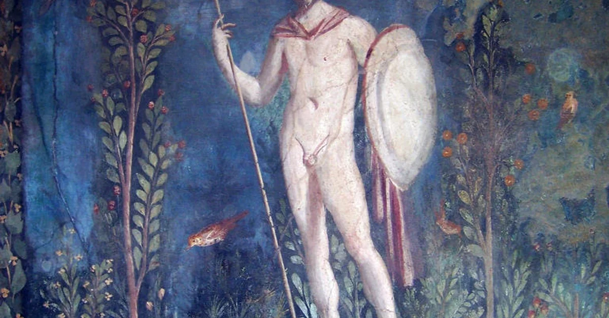 Mars, the Roman god of war, is painted standing on a plinth in this fresco from Pompeii. In a typical pose, he has a spear, shield and crested helmet. (House of Venus, Pompeii)