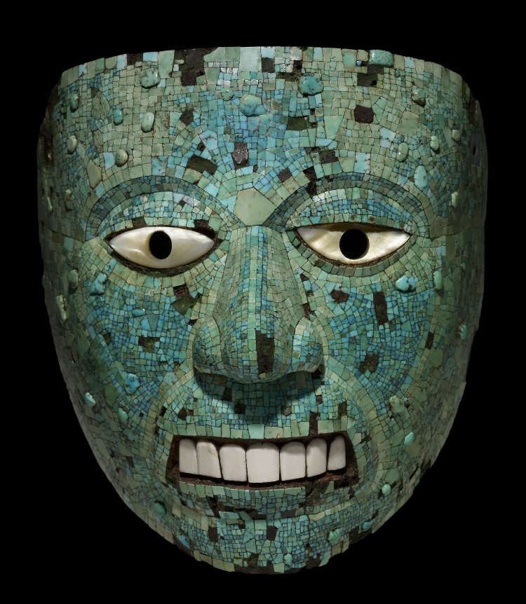 A turquoise mosaic mask representing Xiuhtecuhtli, the Aztec god of fire, 1400-1521 CE. The mask is of cedar wood with mother-of-pearl eyes, conch shell teeth and once with gold leaf on the eyelids. (The British Museum, London).