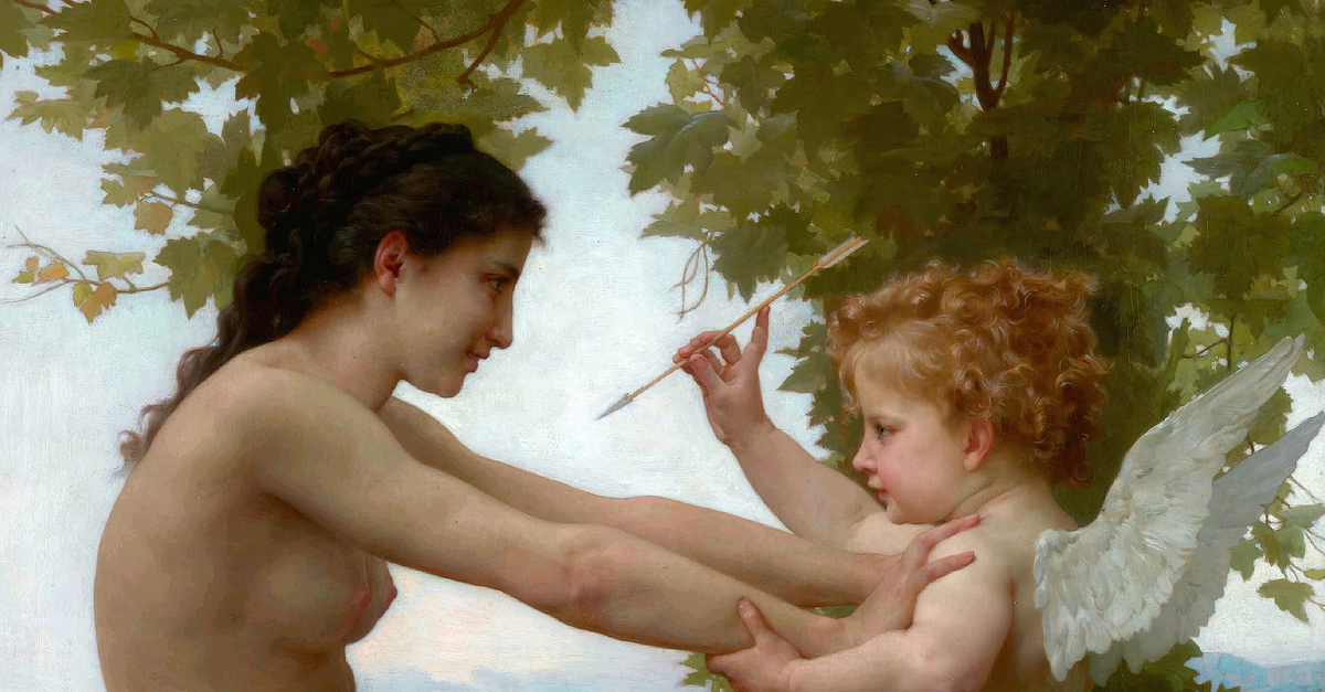 A nude girl sits in an ancient landscape, trying to push away Eros / Cupid, the god of love, who is holding an arrow. Nevertheless, she is smiling, suggesting that she might not really want to prevent him from hitting her with the arrow of love. Adolphe William Bouguereau French, about 1880 Oil on canvas 31 1/4 x 21 5/8 in. 70.PA.3 Getty Museum