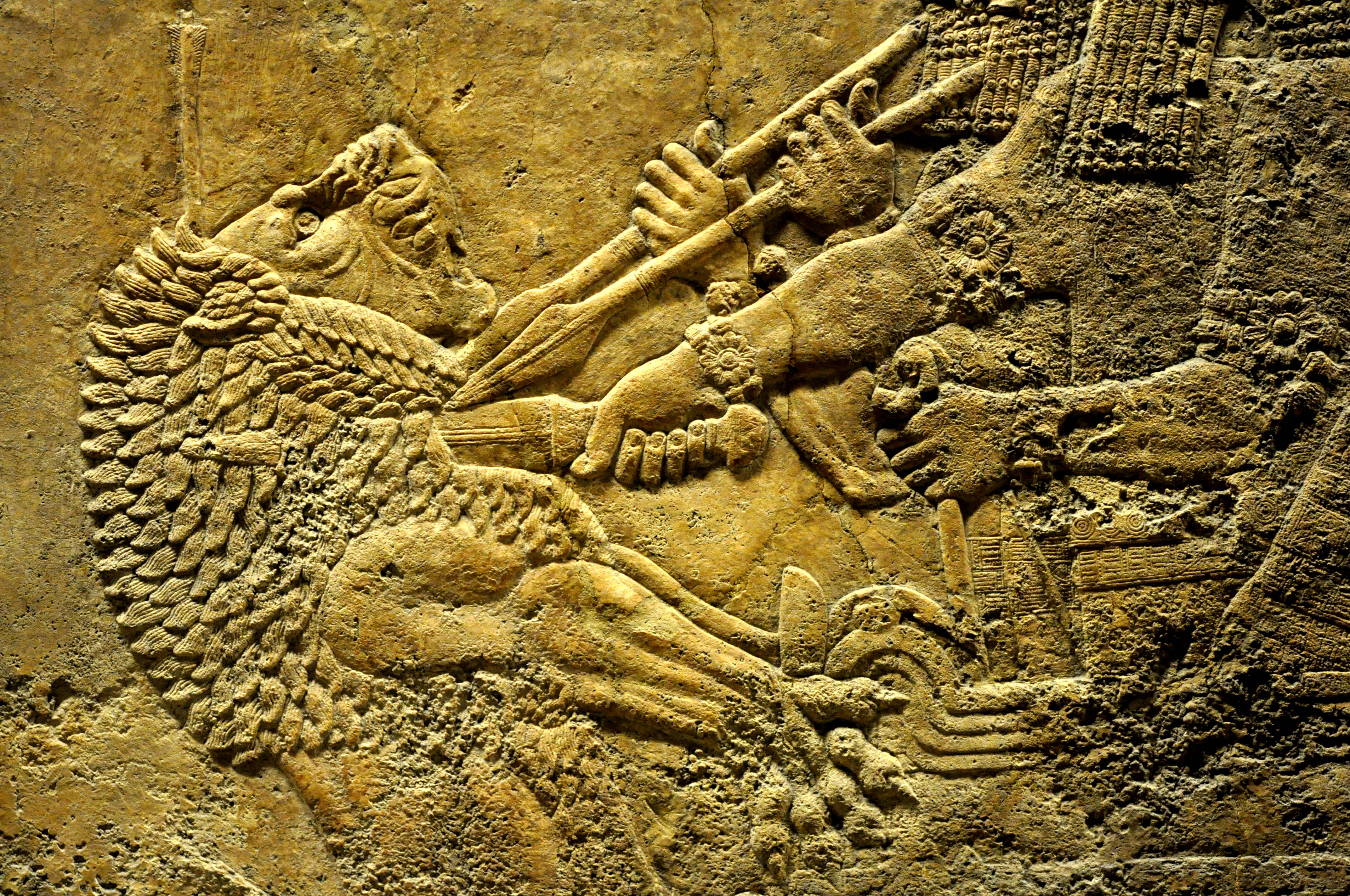 The hunting scenes, full of tension and realism, rank among the finest achievements of Assyrian Art. They depict the release of the lions, the ensuing chase and the subsequent killing.
