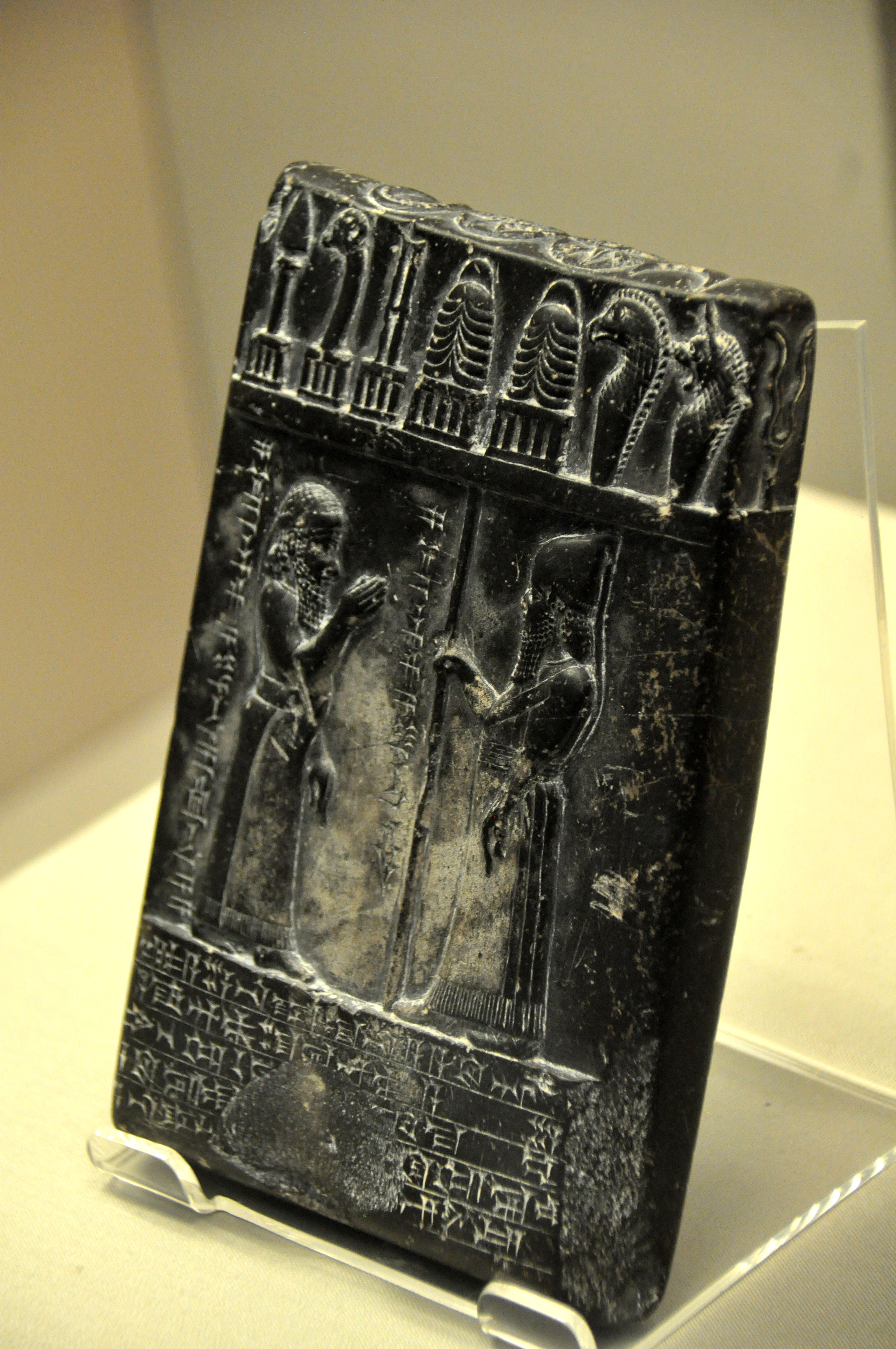This stone tablet records the restoration of certain lands by the Babylonian king Nabu-apla-iddina to a priest. On the top of the stone are 13 symbols of the gods designed to protect the legal statement. Both the king, wearing the typical Babylonian royal hat, and the priest, who has a hand raised in salute, are shown on the obverse with labels identifying them. The cuneiform text dates the deed to the 20th year of Nabu-apla-iddina's reign and says it was sealed with the royal seal in Babylon in the presence of five high officials. Babylonian, c. 870 BCE, from Sippar, Mesopotamia, Iraq. (The British Museum, London)