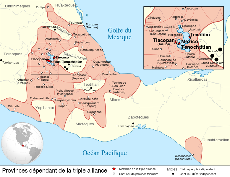 A map indicating the maximum extent of the Aztec civilization which flourished between c. 1345 and 1521 CE in what is now Mexico. The three major cities which formed the Aztec Triple Alliance were Tenochtitlan, Texcoco and Tlacopan.