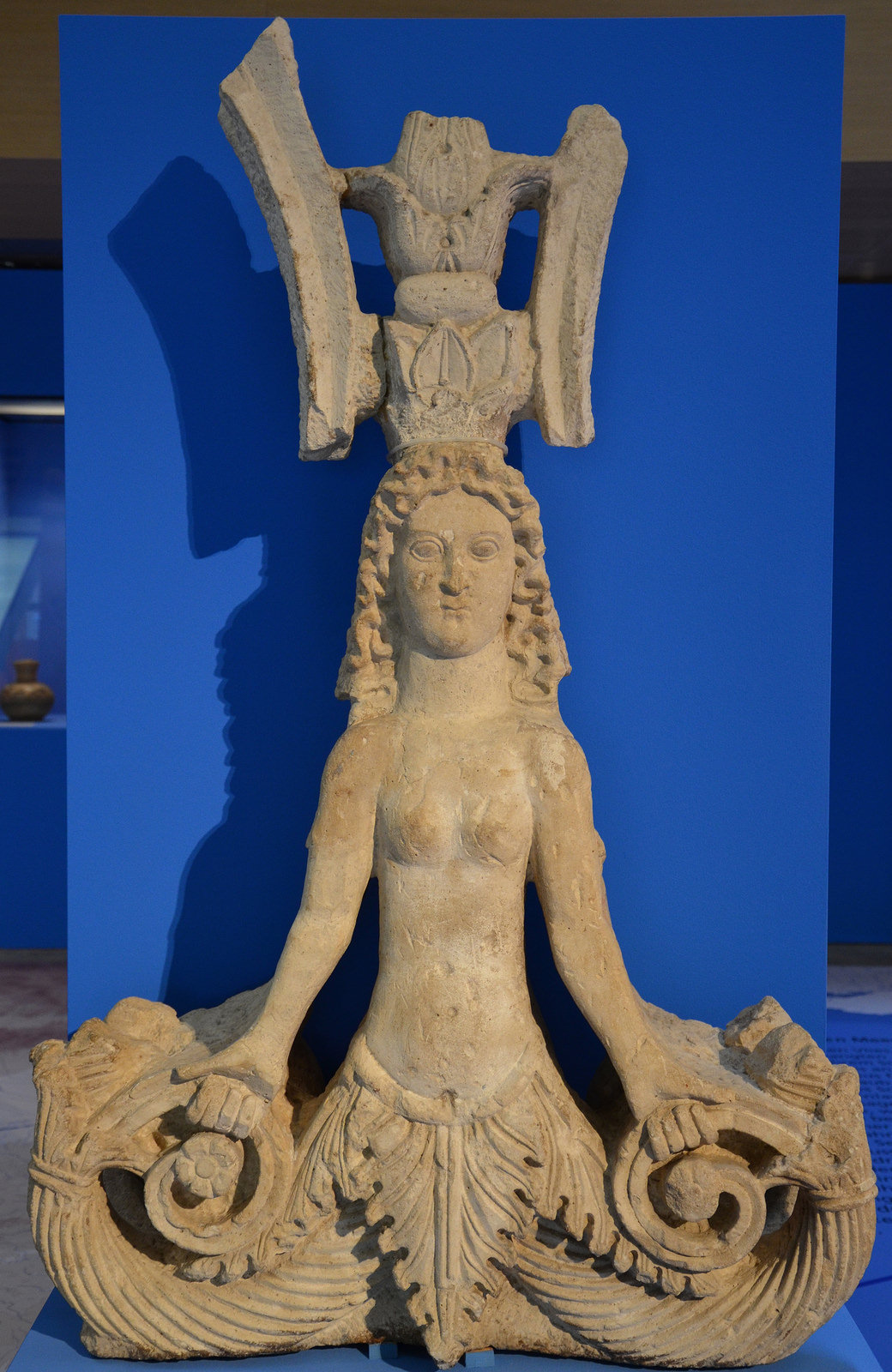 The Mixoparthenos (half-maiden), is a hybrid creature with a double fish-tail from the Black Sea. The limestone sculpture dates back to the 1st-2nd century CE and comes from Panticapaeum in Taurica (Crimea, Ukraine).