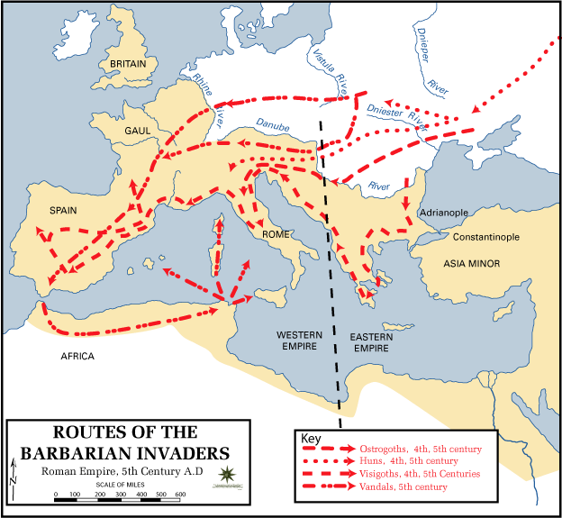 Routes of the Barbarian invaders into the Roman Empire during the Migration Age.
