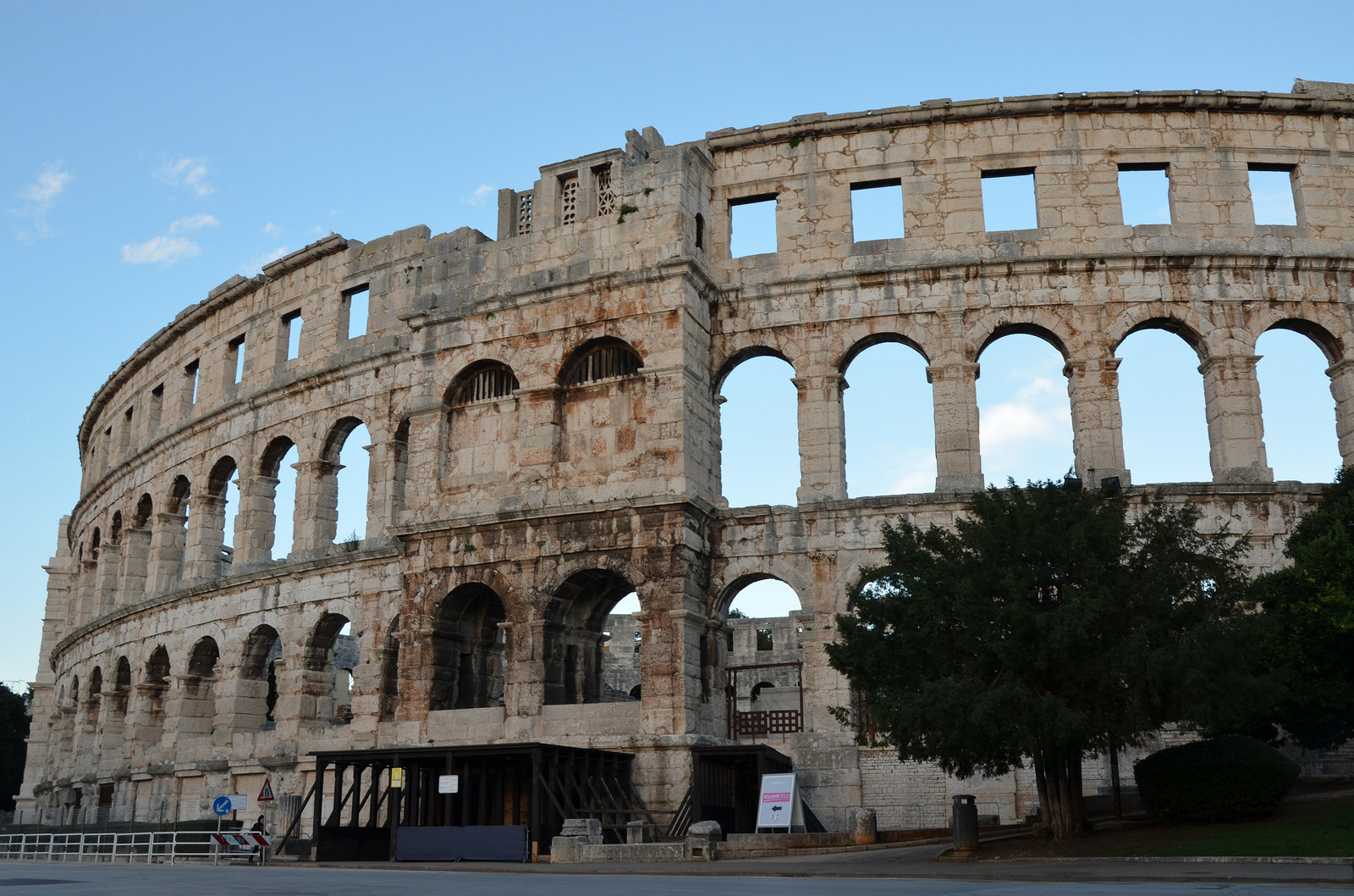 The Pula Arena is the name of the Roman amphitheatre located in Pula, Croatia. It was first constructed in wood during the time of Augustus (27 BCE) and later replaced by an enlarged stone building completed during the reign of Vespasian (68 CE). It is among the six largest surviving Roman arenas in the world.