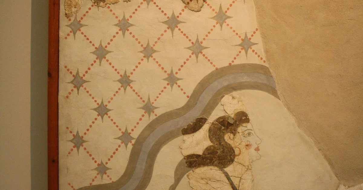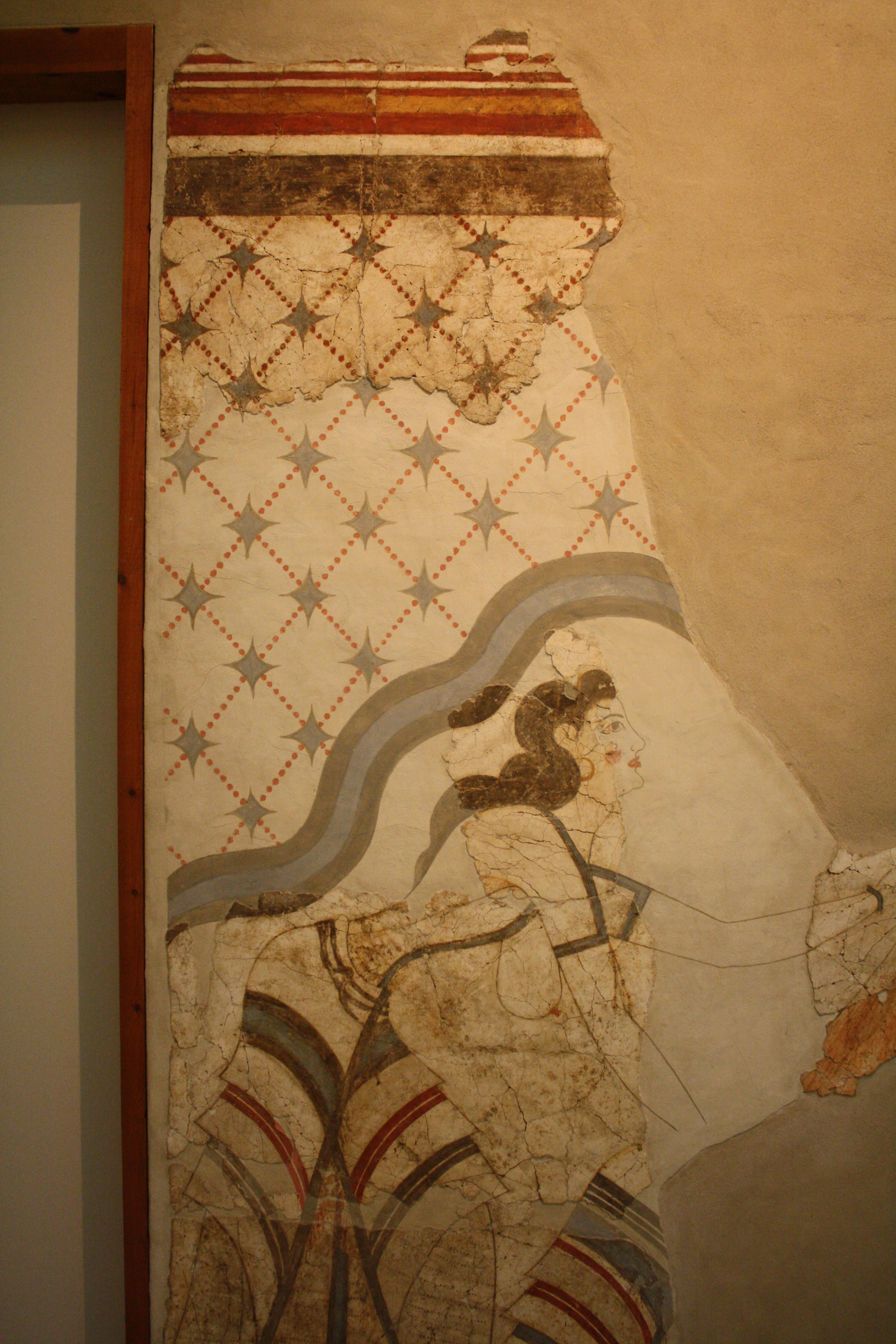 A fresco from the House of the Ladies in Akrotiri on the Aegean island of Thera (Santorini), c. 17th century BCE. The several women depicted on the walls of the room wear typical Minoan dress. Above the women is a representation of a starry sky. (Museum of Prehistoric Thera, Santorini)