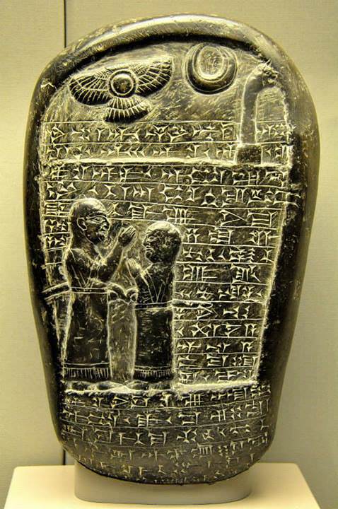 This stela came from the Temple of Marduk in Babylon. It is a commemorative monument set up in honour of a private individual called Adad-Etir. He was an official in the temple, known as 'the dagger bearer', and this stela was erected by his son Marduk-balassu-iqbi. The figures carved in relief on the front represent the father and son together. Their shaven heads show that they are both priests. Babylonian, about 900-800 BCE, From Babylon, Marduk temple, Mesopotamia, Iraq. (The British Museum, London)