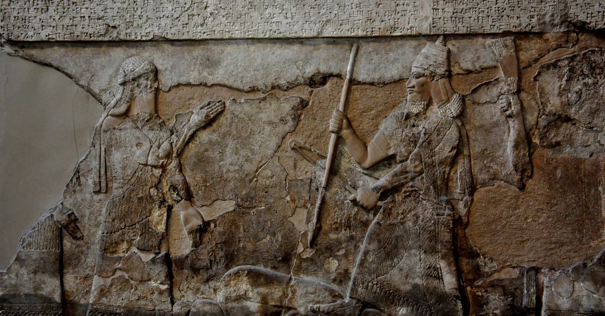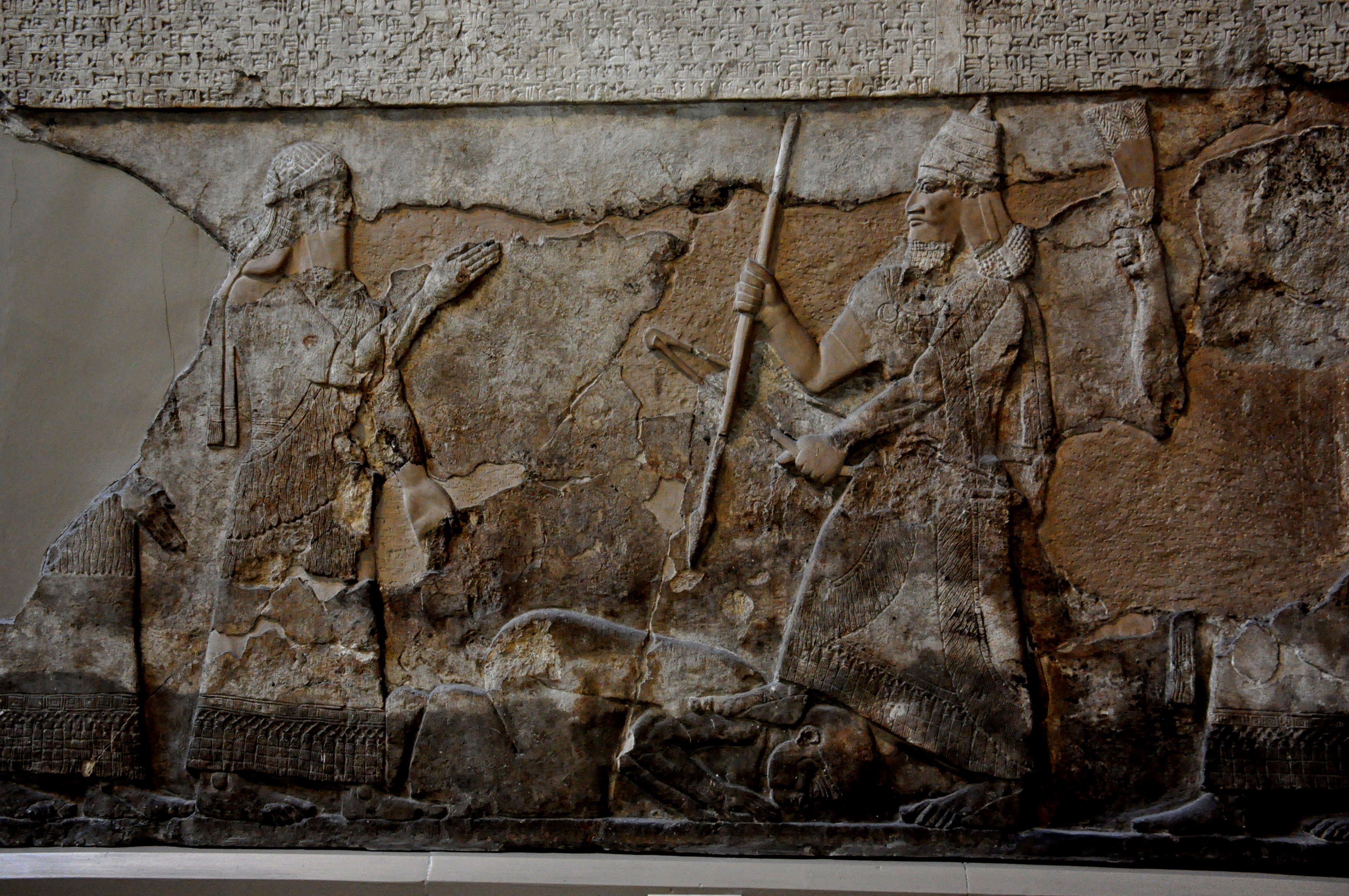 An alabaster bas-relief depicting the Assyrian king Tiglath-pileser III stands over a captured enemy. The cuneiform inscription describes an Assyrian campaign in Iran 744 BCE. From the central palace at Nimrud (ancient Kalhu), reused and moved in the south-west palace, Mesopotamia, northern Iraq. Neo-Assyrian era, 728 BCE. (The British Museum, London)