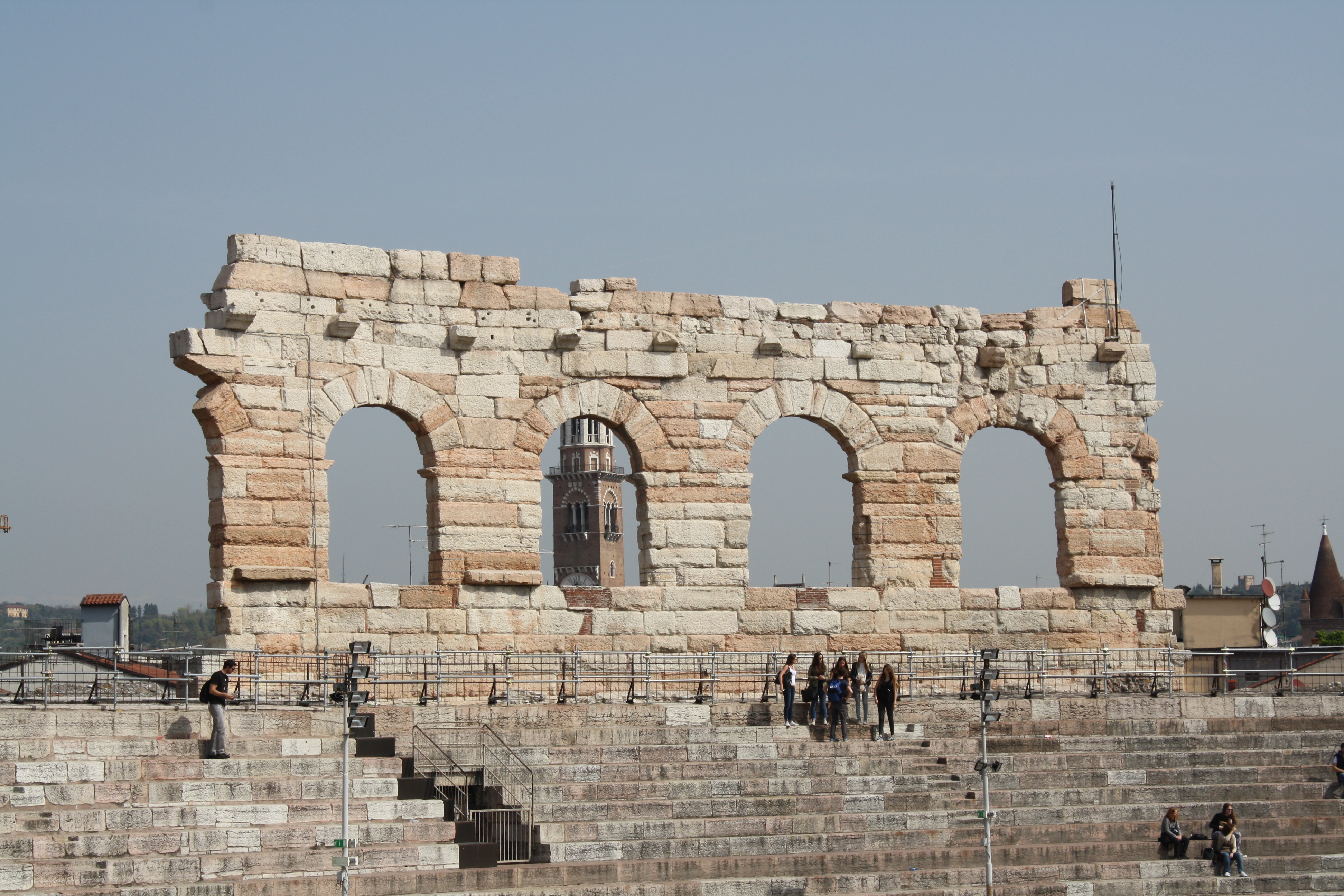 The remaining top tier of arches of the Roman amphitheatre of Verona, Italy, 1st century CE. The arena was the third largest in the Roman world and used to host gladiator, circus and equestrian events.