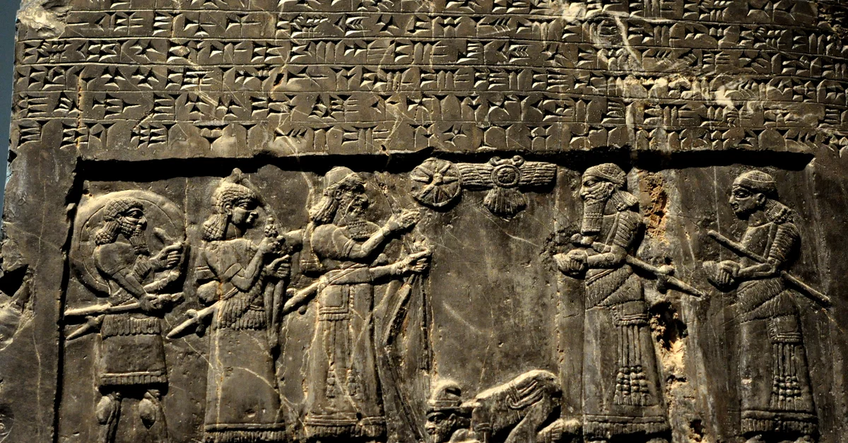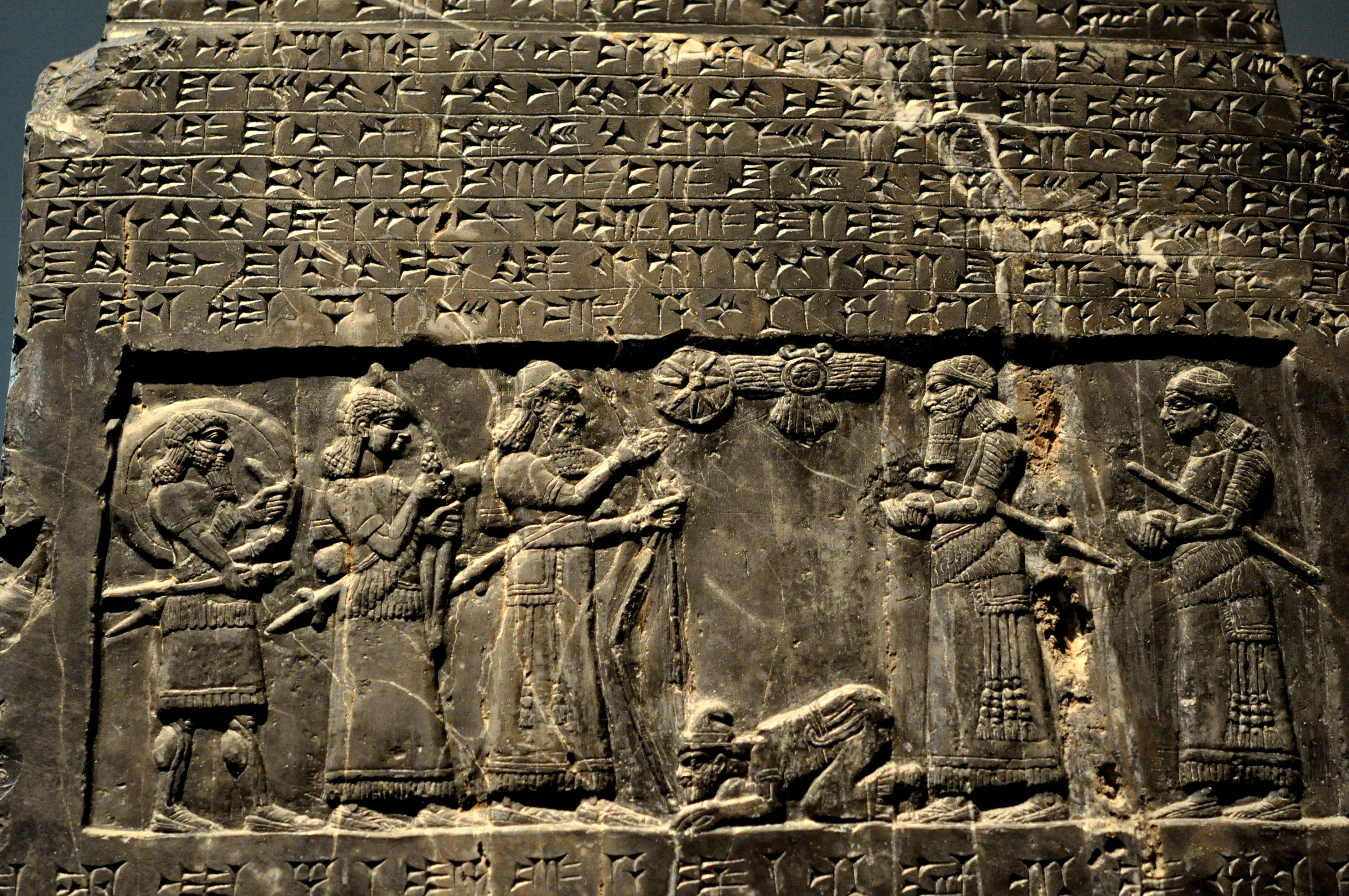 The Assyrian king Shalmaneser III, holding a bow, receives a tribute from Sua the Gilzanean. The king faces his field marshal and another official.From Nimrud, (ancient Kalhu), near the building of Shalmaneser, neo-Assyrian era, 827 BCE, Mesopotamia, northern Iraq. (The British Museum).
