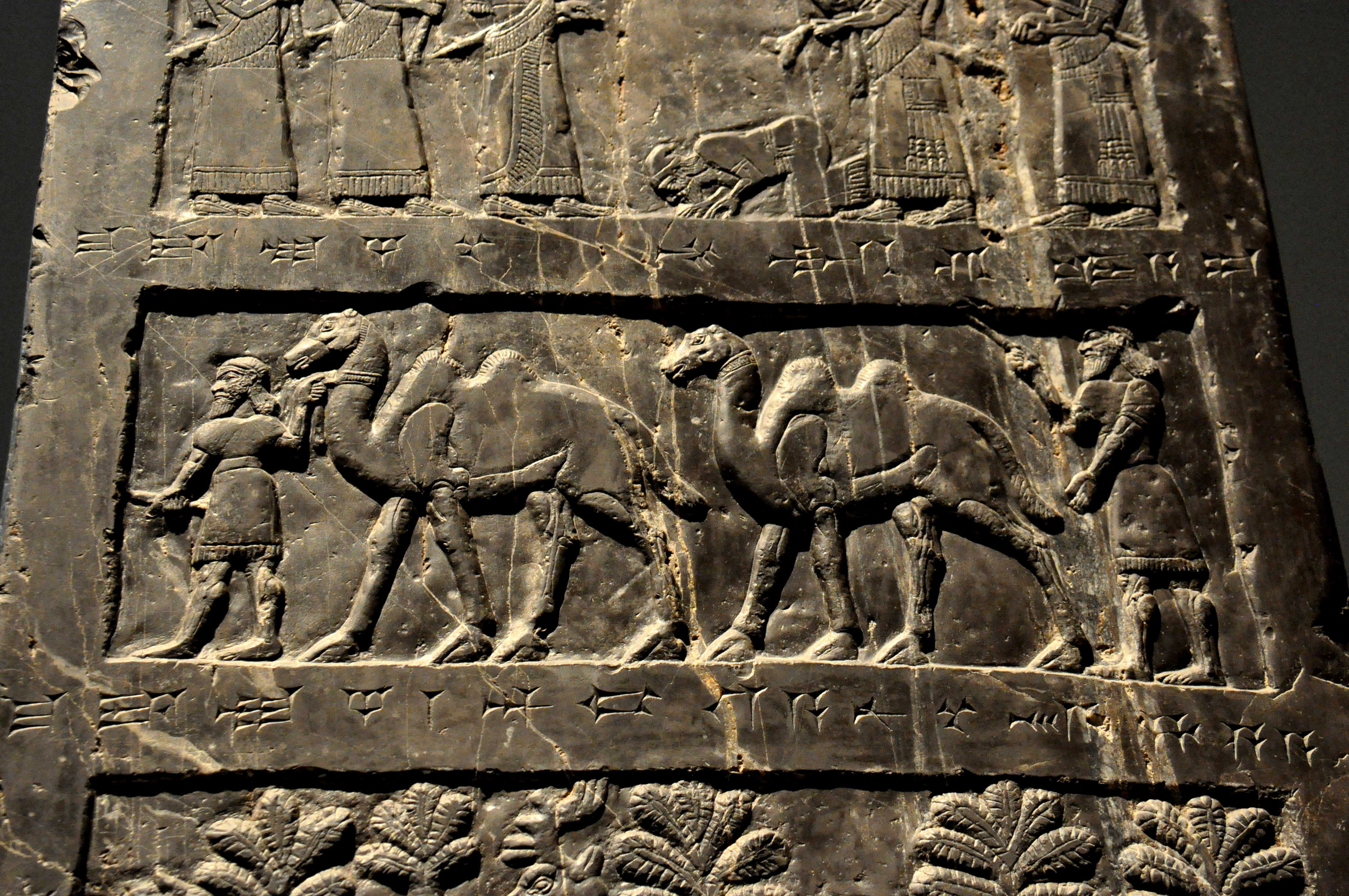 Attendants bring tribute from Musri with two-humped camels. Musri, meaning a borderland, probably refers to a country in eastern Iran or in Egypt. From Nimrud, (ancient Kalhu), near the building of Shalmaneser, neo-Assyrian era, 827 BCE, Mesopotamia, northern Iraq. (The British Museum).