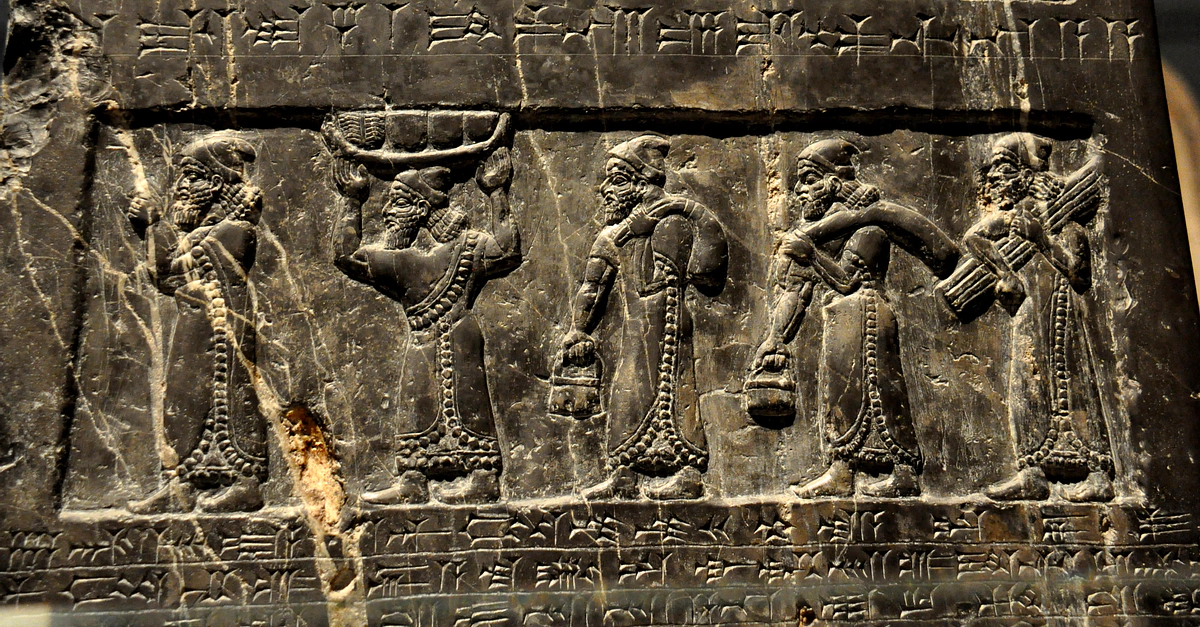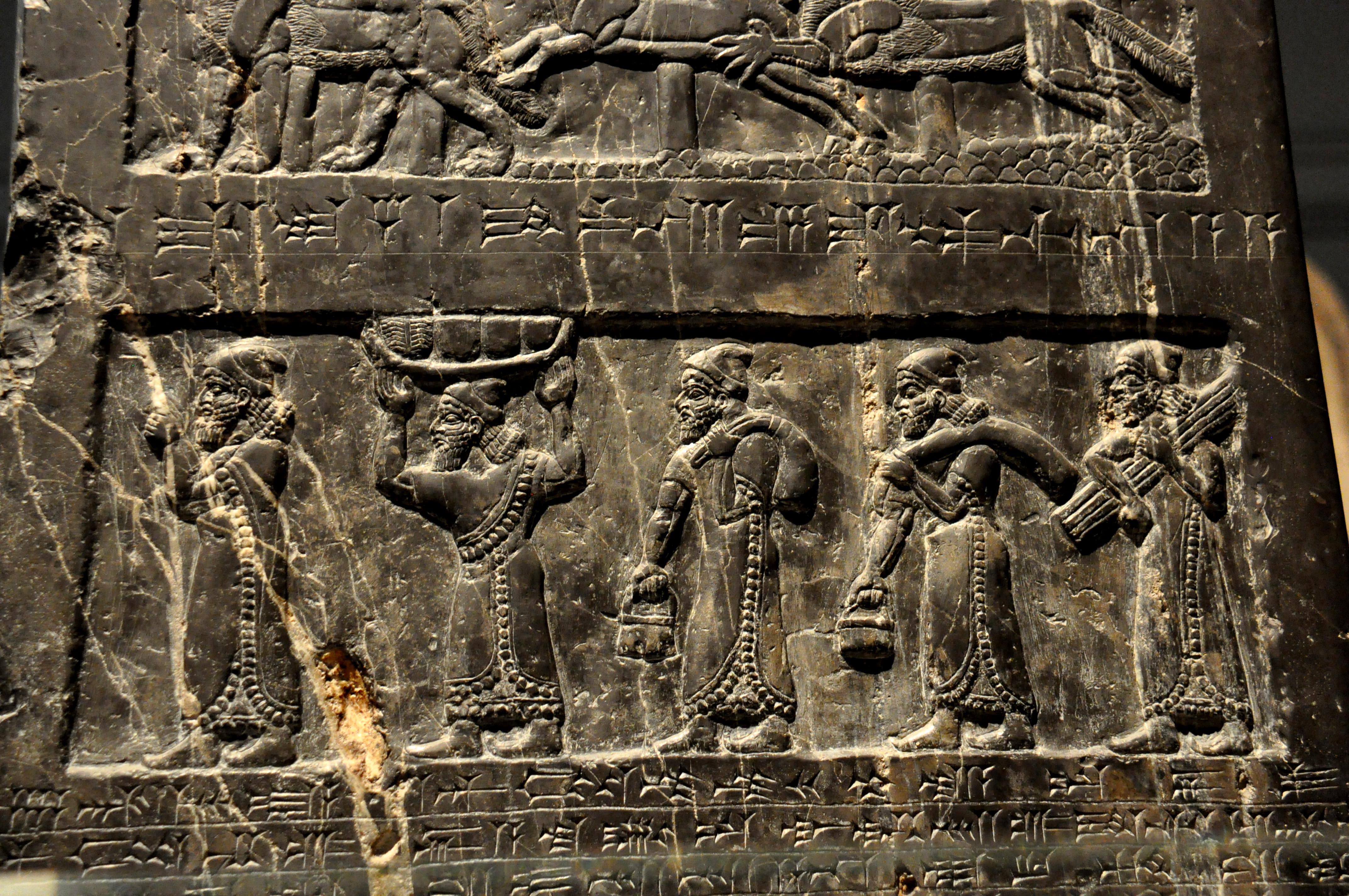 Tribute from Qarparunda the Patinean: silver, gold, tin, "fast" bronze, ivory (tusks), and ebony. Patina is modern Antakya, south of Turkey. From Nimrud, (ancient Kalhu), near the building of Shalmaneser, neo-Assyrian era, 827 BCE, Mesopotamia, northern Iraq. (The British Museum).