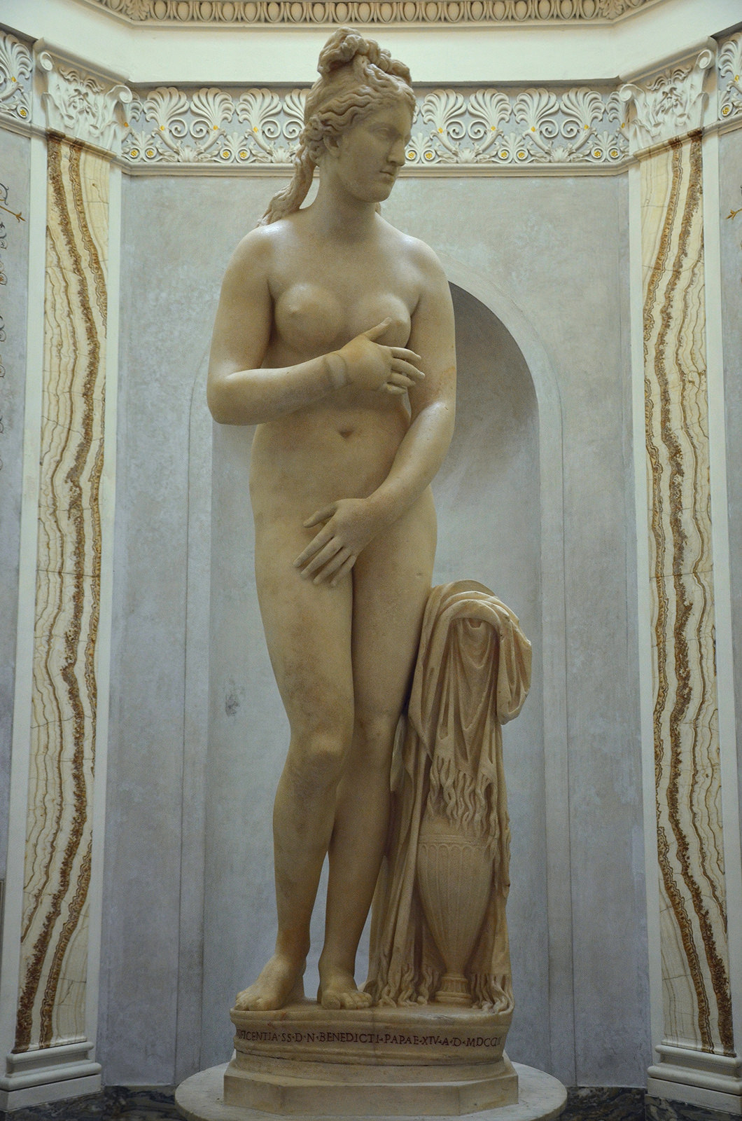 The Capitoline Venus is a type of statue of Venus, specifically one of several Venus Pudica (modest Venus) types, of which several examples exist. The type ultimately derives from the Aphrodite of Cnidus. The so-called “Capitoline Venus” is an Antonine copy of a late Hellenistic sculpture that ultimately derives from Praxiteles (4th century BCE). (Capitoline Museums, Rome)