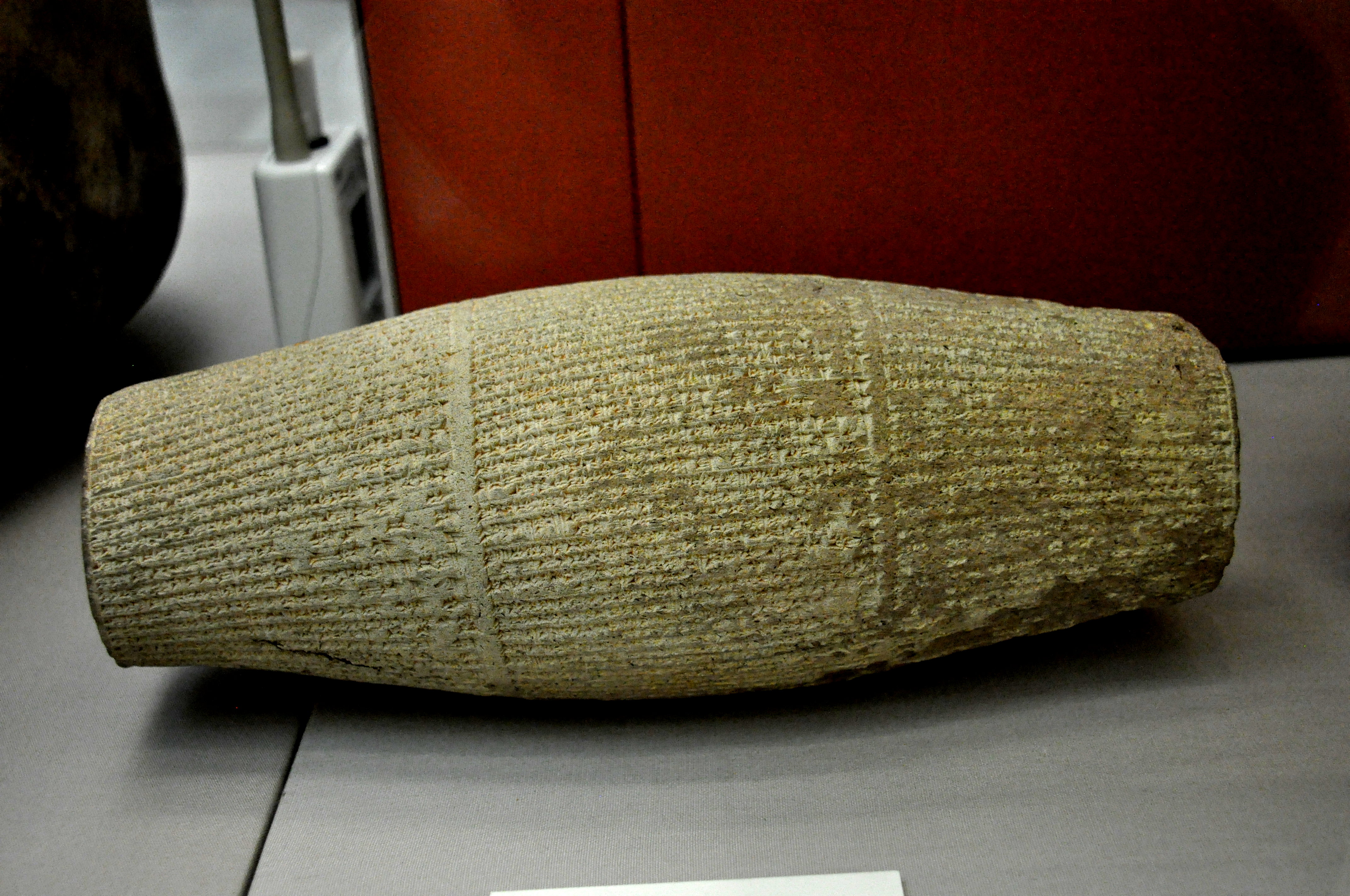 The three columns of cuneiform inscriptions on this cylinder mention the building and reconstruction of various shrines, quays, gates, and processional boats by king Nebuchadnezzar II at Babylon for the Babylonian New Year Festival. From Babylon (modern Babel Governorate), neo-Babylonian era, 604-562 BCE, Mesopotamia, Iraq. (The British Museum).