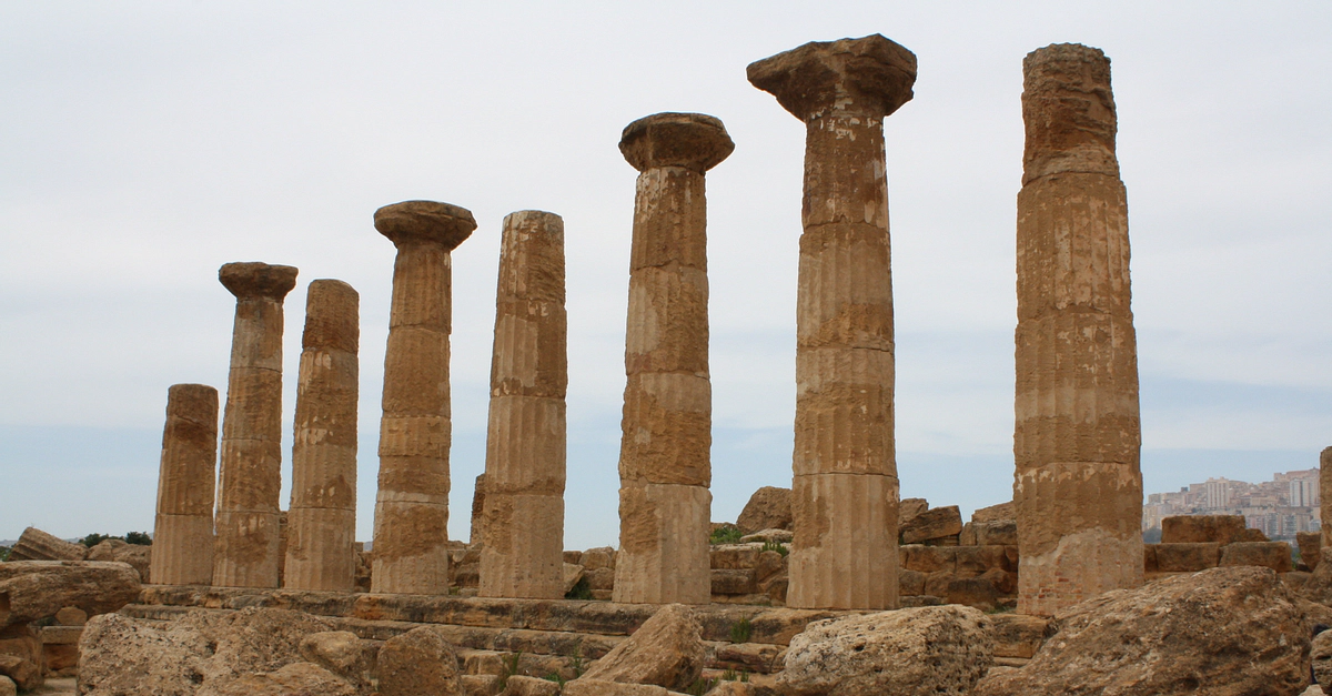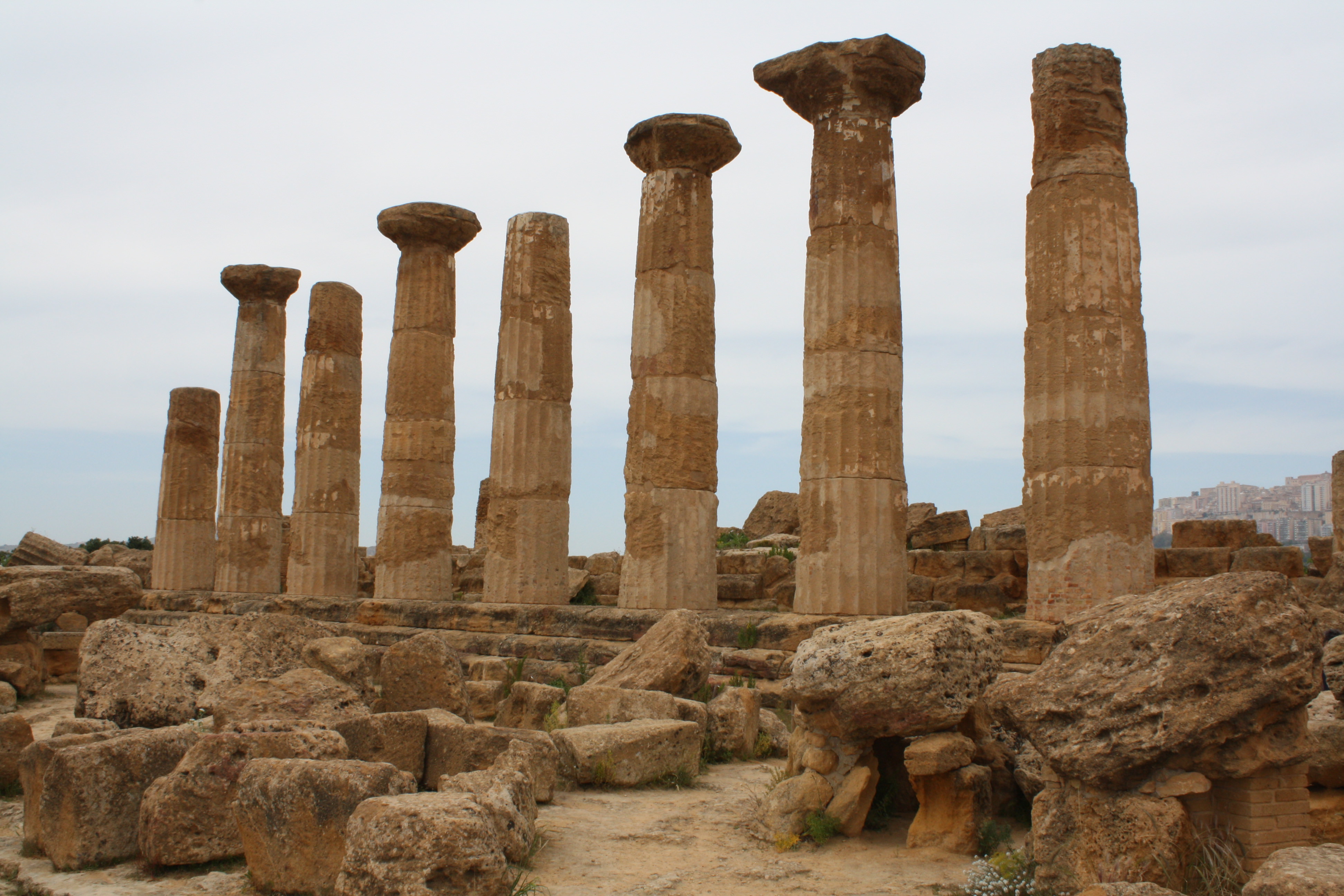 The remaining columns of the Temple of Hercules, Agrigento, Sicily. Built in the 6th century BCE, the temple originally had 6 columns on each facade and 15 along the sides.