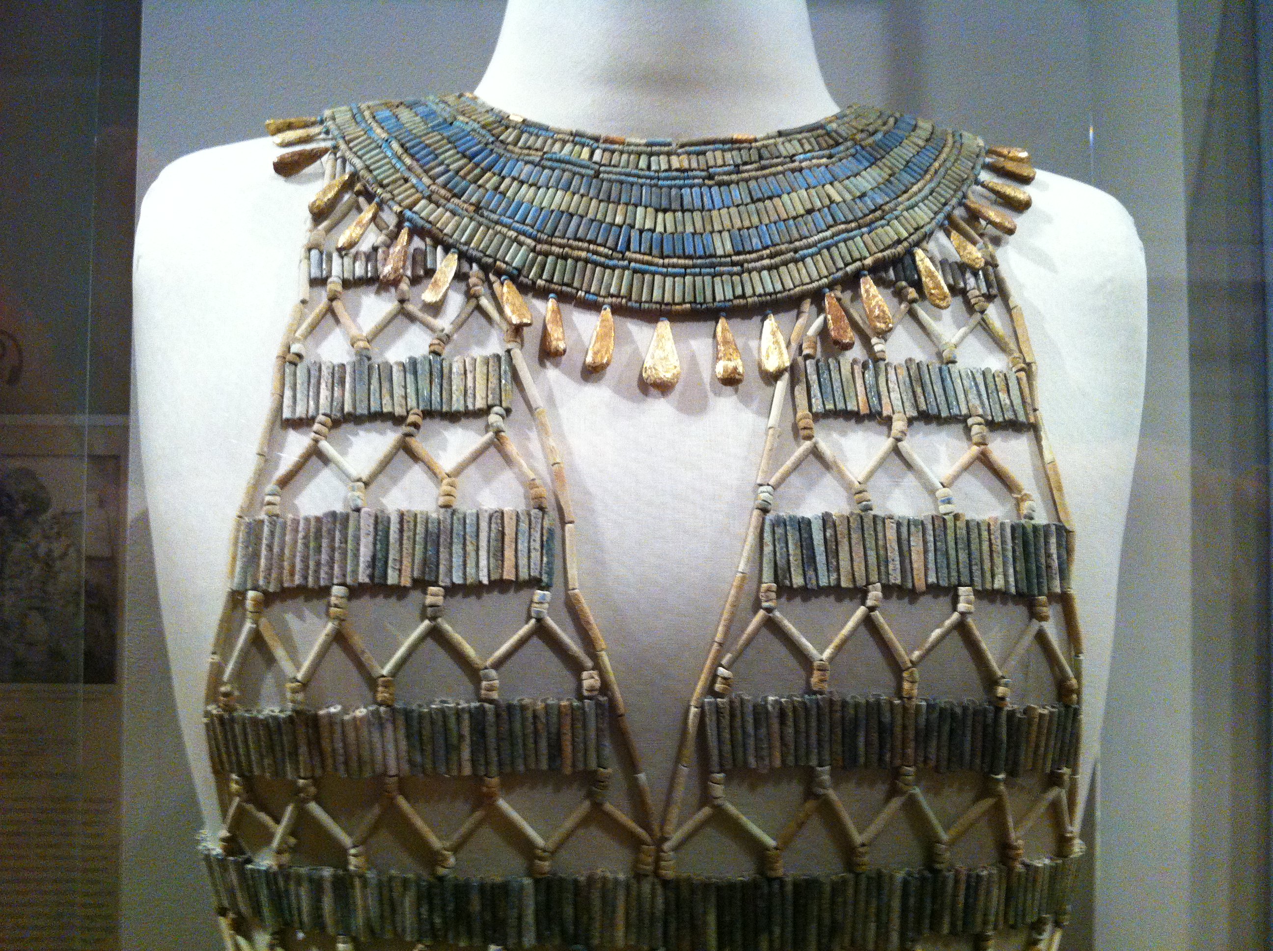 This beadnet dress is the earliest surviving example of a garment with the lozenge pattern. This pattern is frequently used when depicting women's clothing in Egyptian art. Although the string had deteriorated, many of the beads were found in their original pattern. It is unclear whether the beadnet dress was sewn into the clothing or worn as a separate net over the linen.