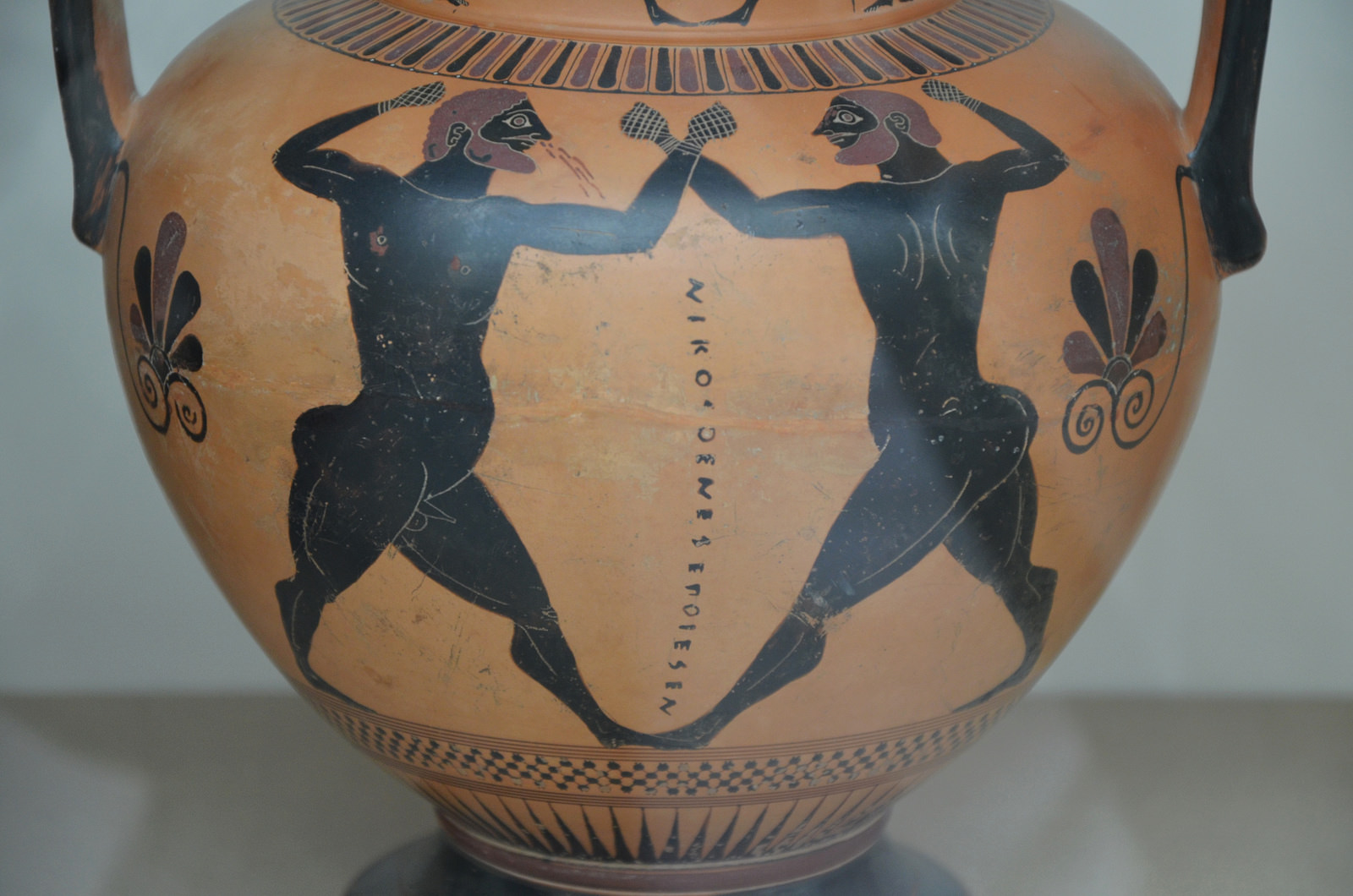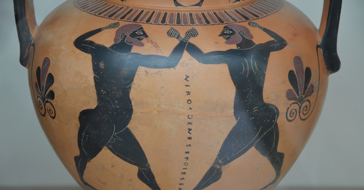 Black-figured amphora showing a boxing contest, made in Athens about 550-500 BCE, signed by the potter Nikosthenes, from Agrigento (Sicily). The boxers wearing himantes (leather thongs bound on the fist) are about to exchange blows. The boxer on the left already has a nose-bleed. (British Museum)