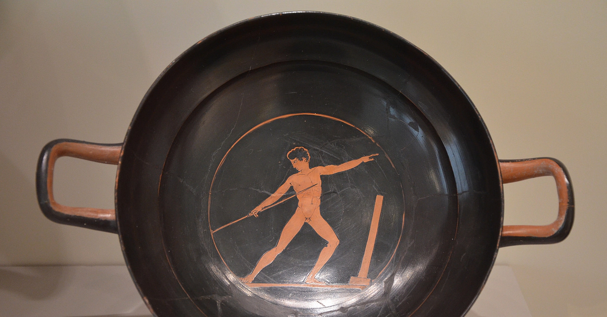 Attic red-figure cup (kylix) depicting an athlete ready to throw the javelin, from Vulci (Italy), around 440/430 BCE. (Altes Museum, Berlin).