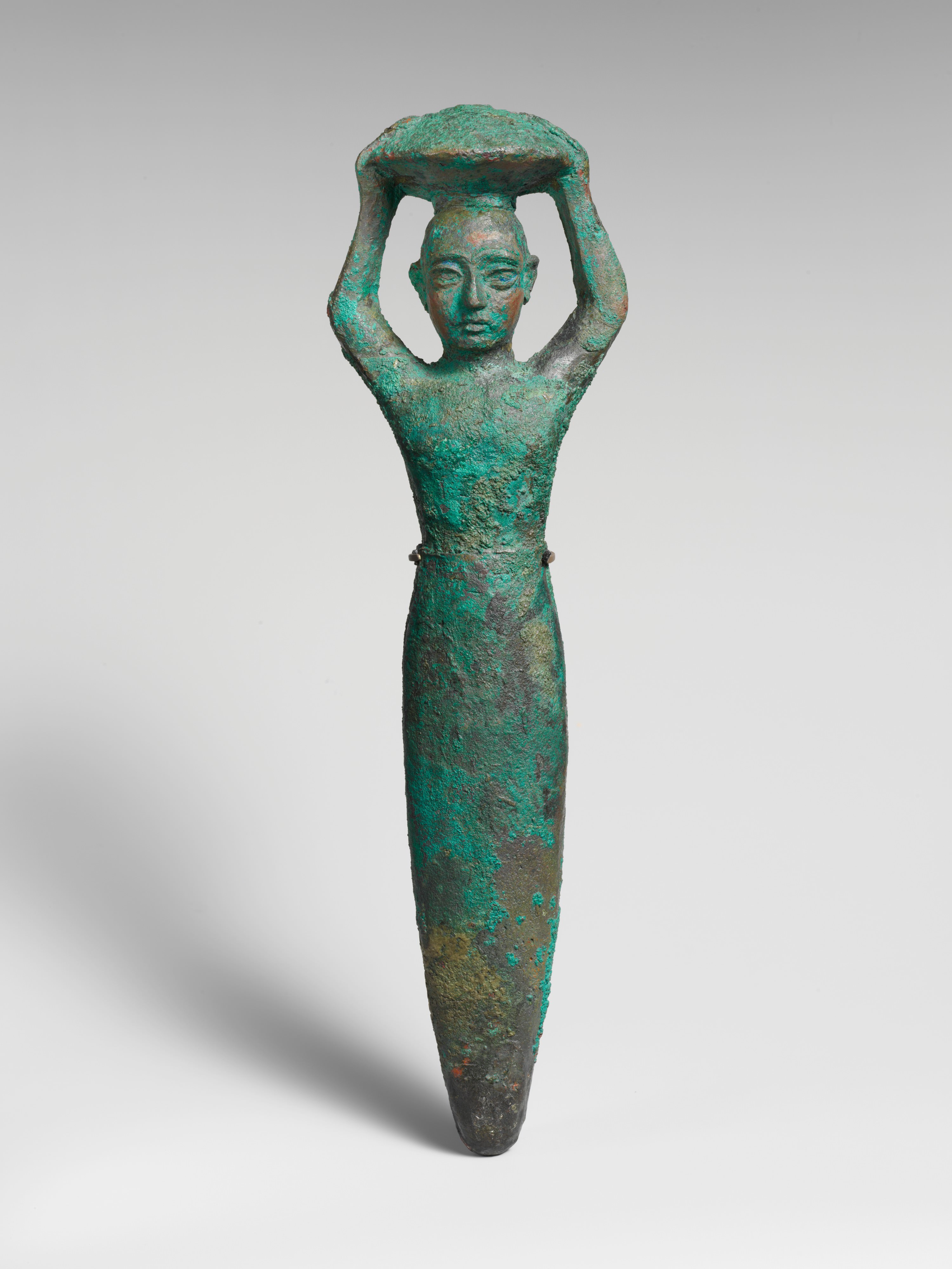 Foundation figure of King Shulgi of Ur carrying a basket, copper, c. 2094–2047 BCE. Foundation figures were buried in the foundations of a temple and show the king carrying building materials for the temple. Building and restoring temples was a pious act expected of Mesopotamian kings of this period.