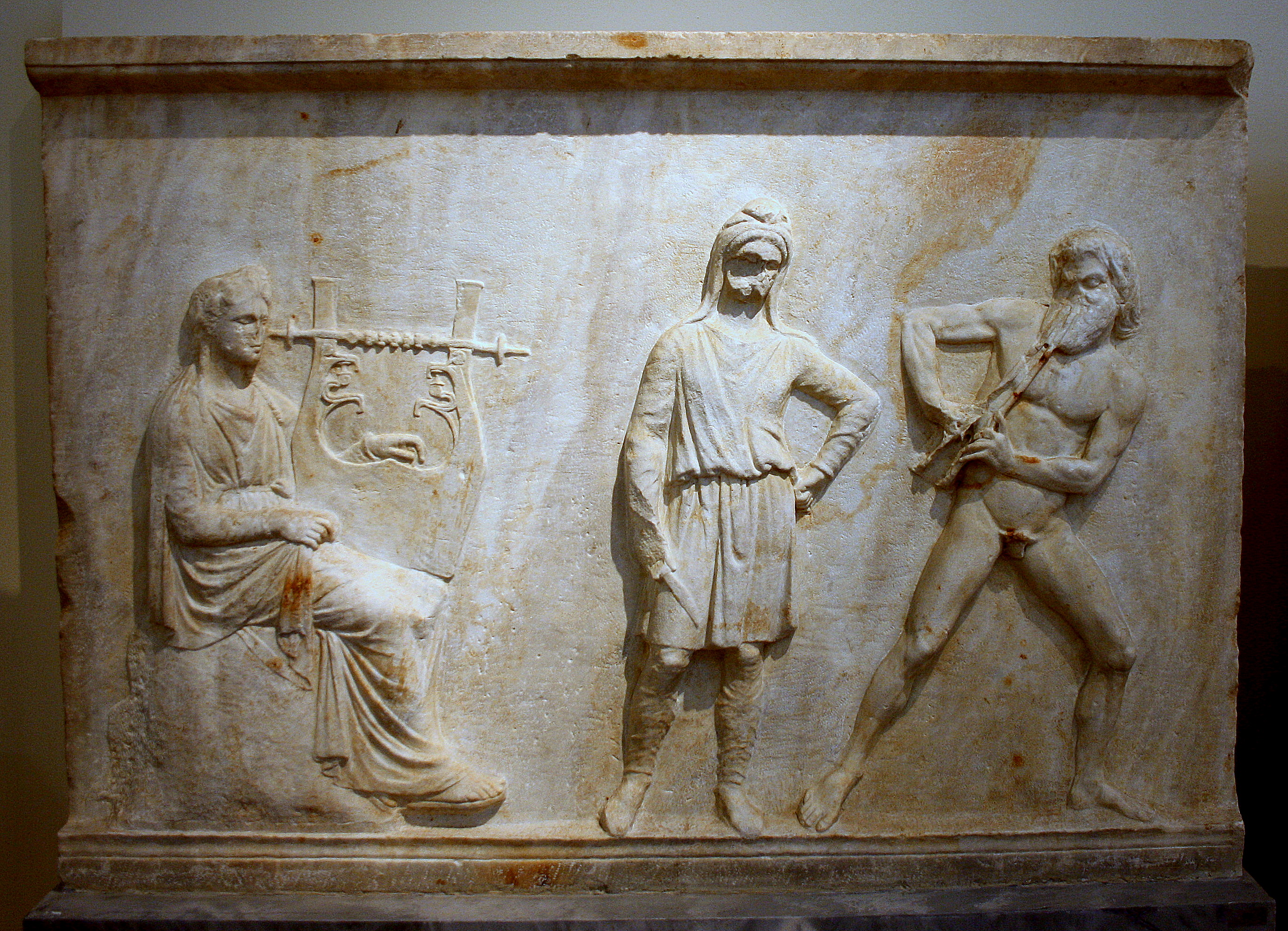 National Archaeological Museum, Athens, 215. 330-20 BCE. This relief slab is one of four that made up the revetment of a pedestal (only three survive), and was found at Mantineia, Arcadia. The pedestal either acted as a base for a statue group of the Delian trinity (Leto, Apollo, and Artemis) or as an altar. On this relief the musical agon between Apollo and Marsyas is depicted. Apollo sits at left with his kithara, listening to Marsyas, at right, playing his auloi. At centre is the Scythian who will punish Marsyas for loosing the agon by flaying him; his knife is held ready in his right hand.