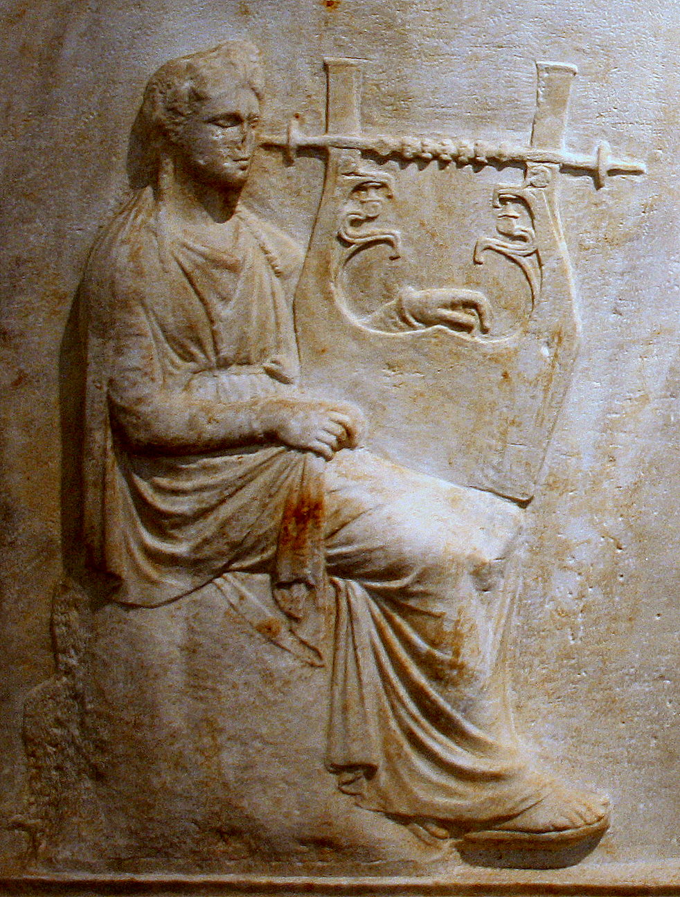 Detail of Apollo from NAM, Athens, 215. He is seated on a tree stump, wearing chlamys and chiton, and sandals. In his left hand he rests his seven string lyre (the stings would have been painted; the number of tuning pegs gives their frequency.)