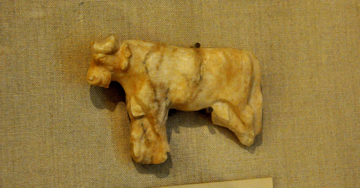 An alabaster inlay of a bull. Early dynastic period, 2750-2300 BCE. From Sumer, southern Mesopotamia, Iraq. (The Burrell Collection, Glasgow, Scotland).