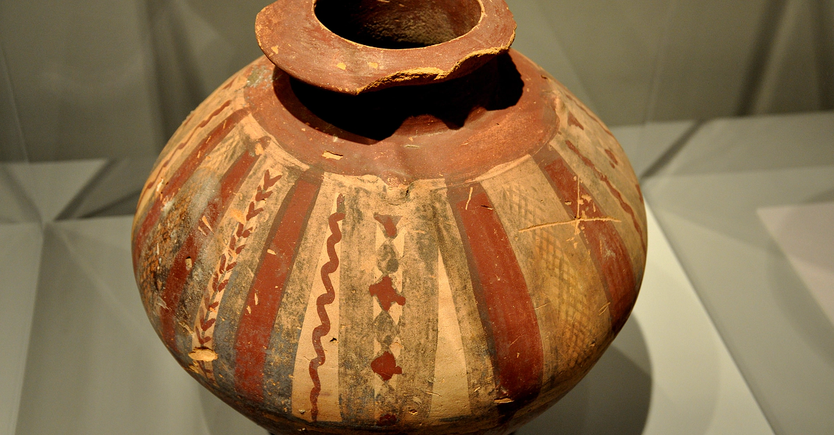 This painted jar dates back to the Jemdet Nasr period, 3100-2900 BCE. The jar displays geometric grey and red motifs. (The Sulaimaniya Museum, Iraq).