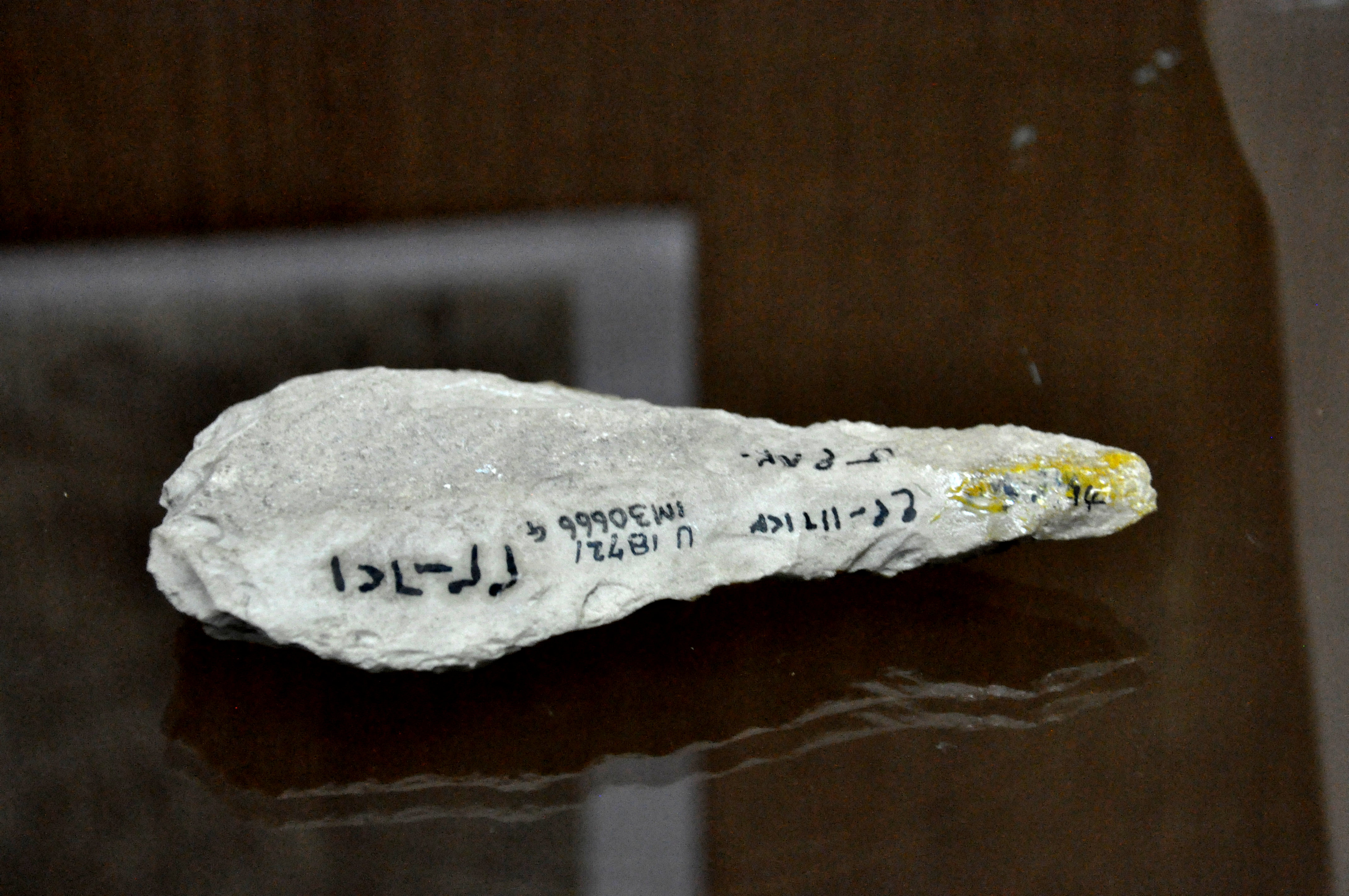 This hand-axe was found in Hazar Merd cave, a paleolithic cave which lies 13 km west of modern Sulaimaniya city, Iraq. It dates back to 50,000 BCE. (The Sulaimaniya Museum, Iraq).
