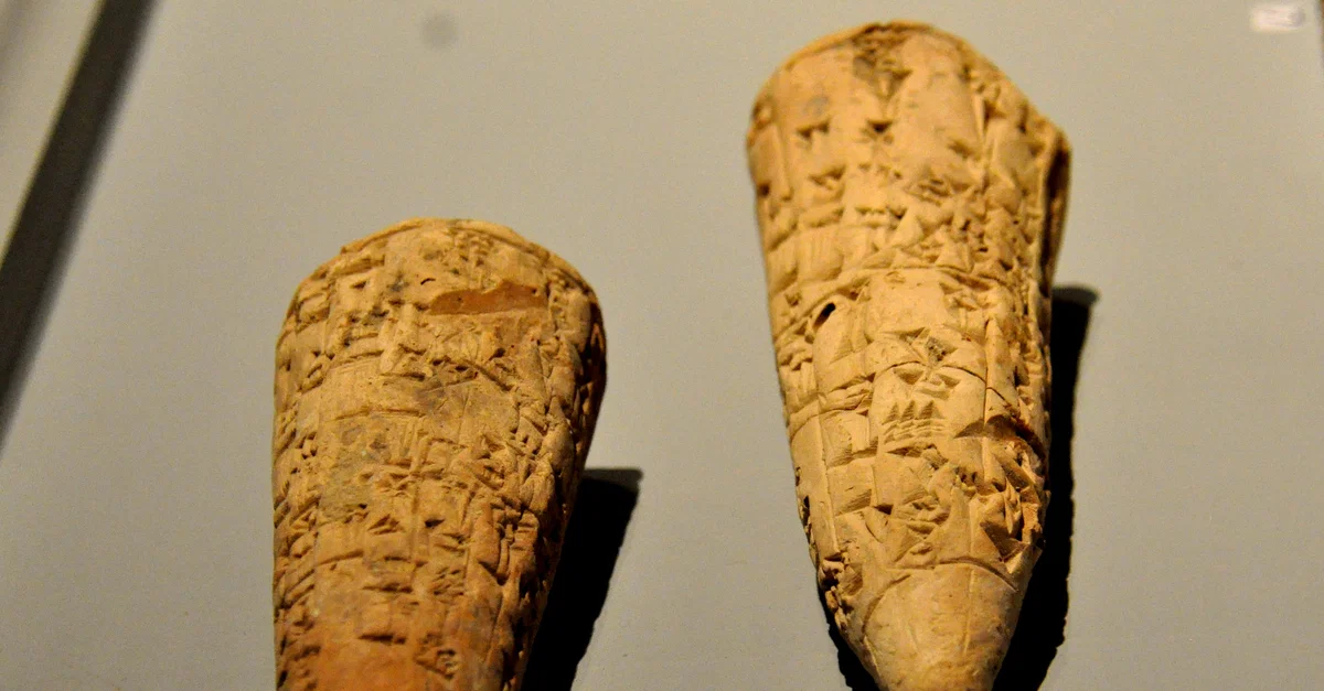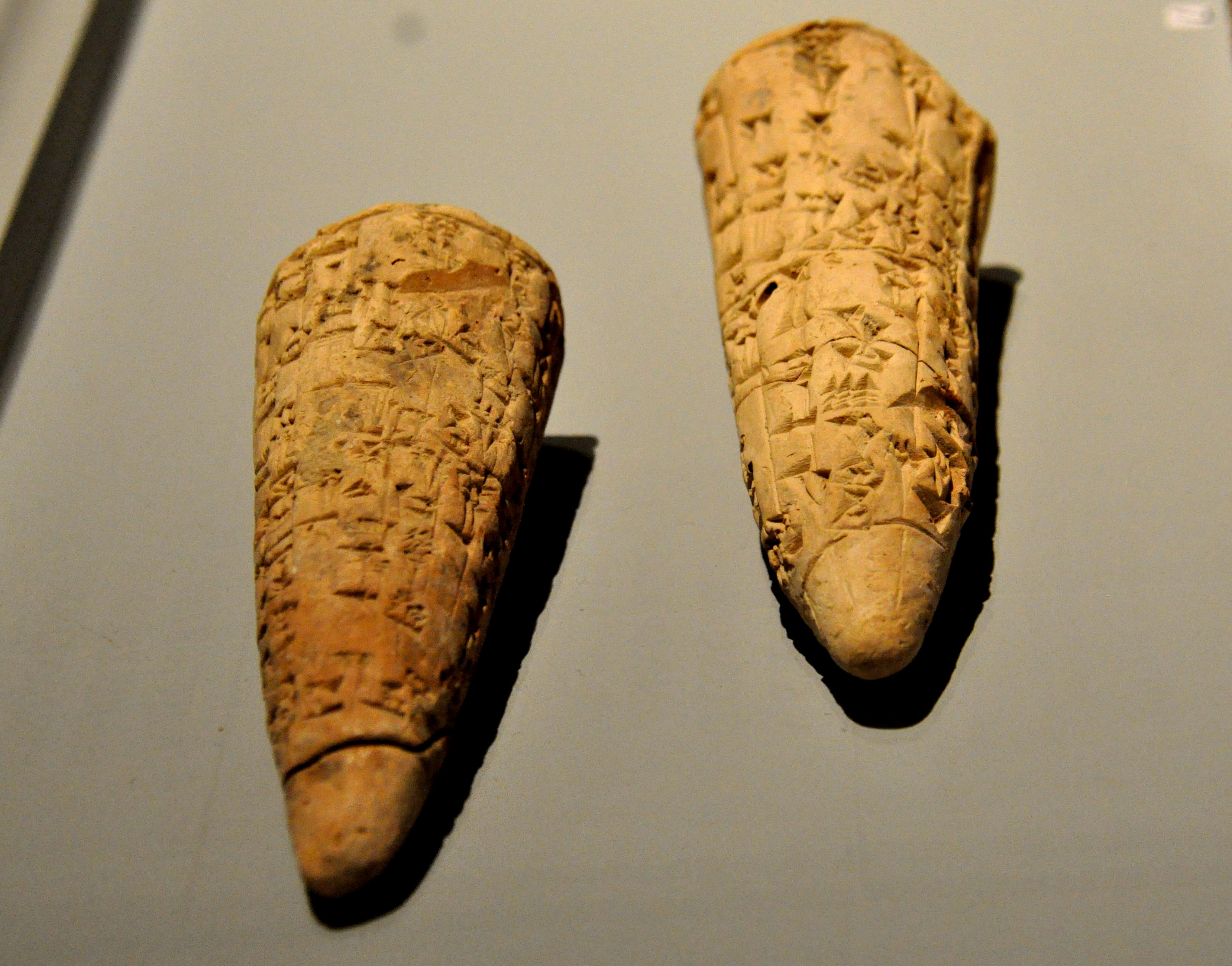 Cuneiform inscriptions on foundation cones record the building and rebuilding of various god and goddesses temples in Mesopotamia. One of these cones records the building of the temple of the god Numushda in the city of Kiritab by Enlil-Bani, king of Isin. Old Babylonian era, 2003-1595 BCE. (The Sulaimaniya Museum, Iraq).