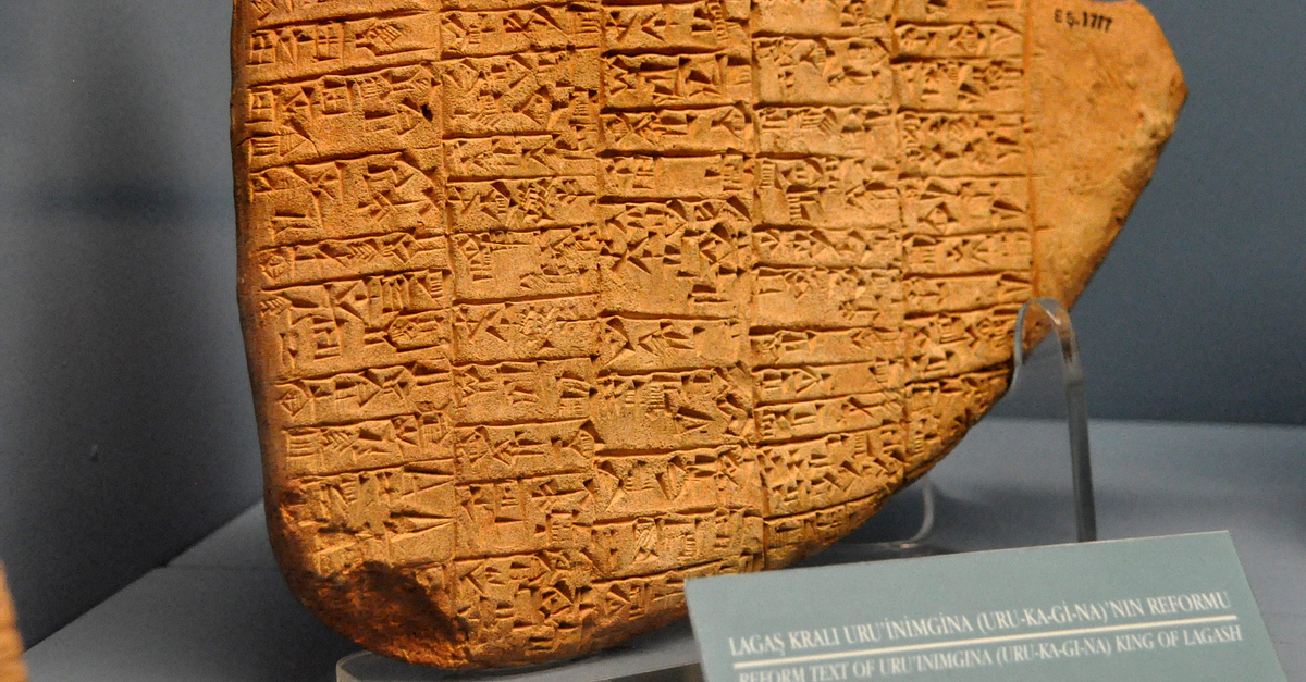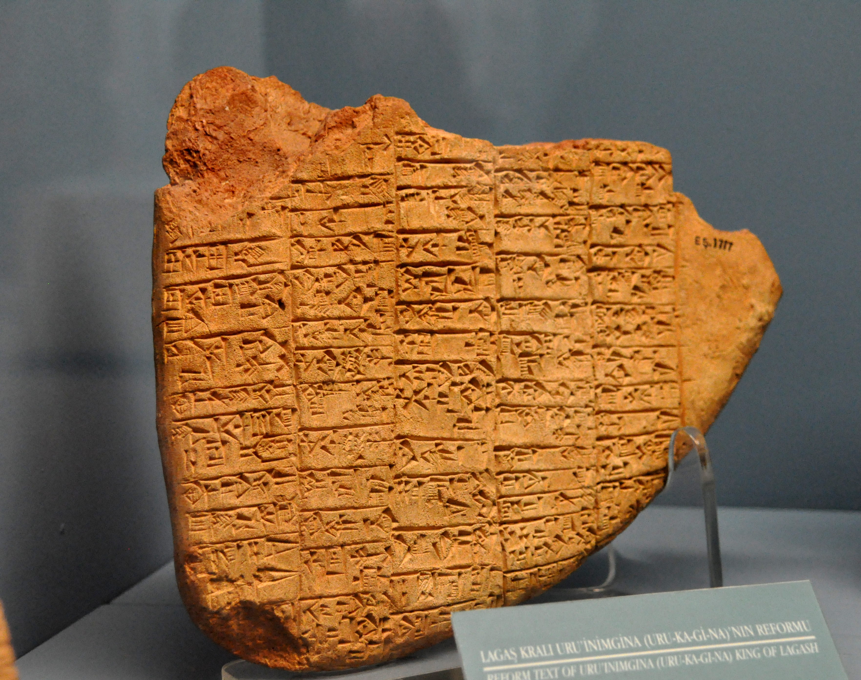 This reform text belongs to King Uru'inimgina (or URU-KA-GI-NA), king of Lagash. From Girsu (modern Tell Telloh, Dhi-Qar Governorate, Iraq), Southern Mesopotamia, Iraq. Early dynastic period, 2351-2342 BCE. (Istanbul Archaeological Museums/Ancient Orient Museum, Istanbul, Turkey).