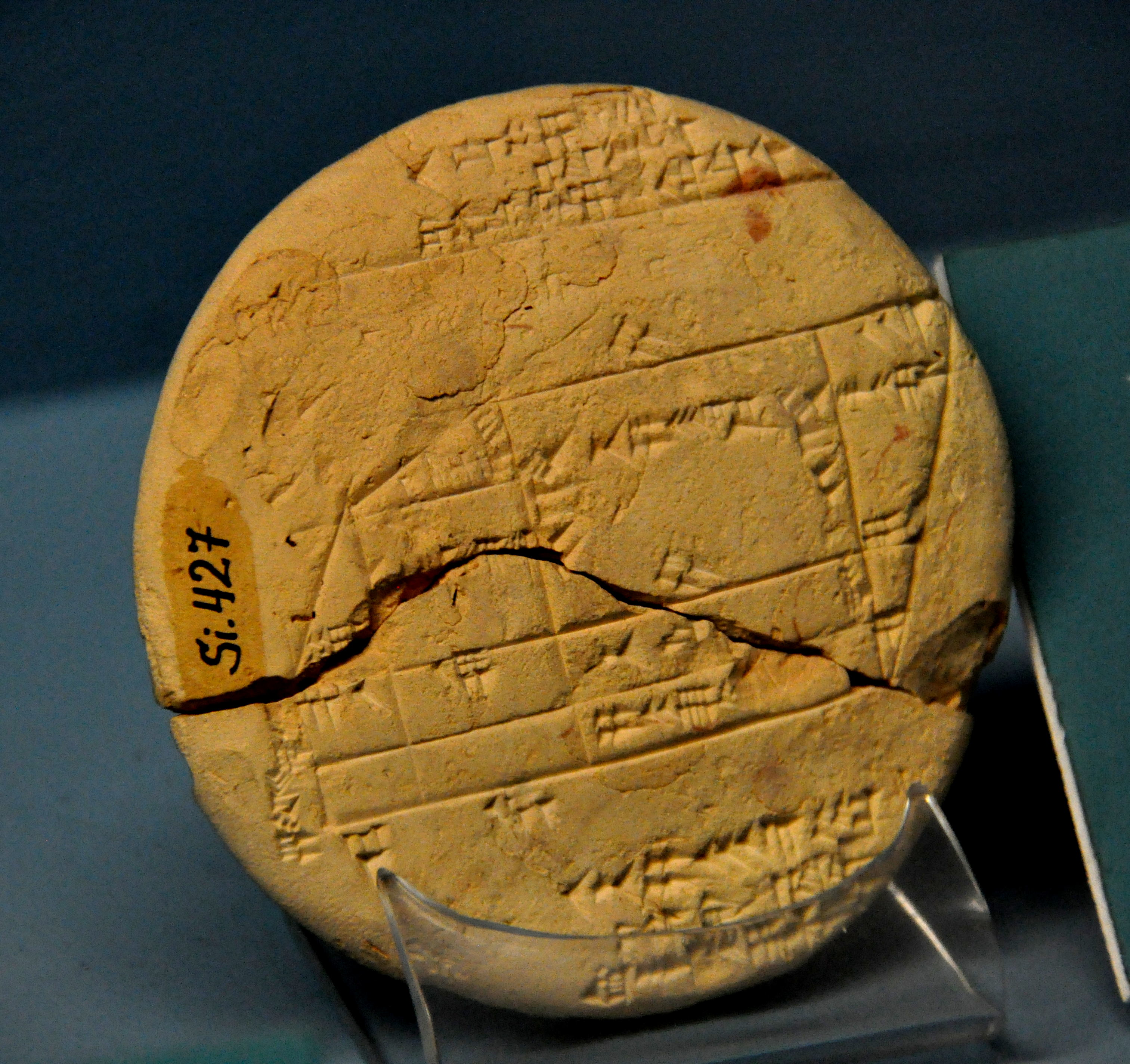 Inscribed on this rounded terracotta tablet is a cadastral text which registers real estate at Sippar. It was written in Akkadian language. Old Babylonian era, 18th century BCE. From Sippar (modern Tell Abu Habbah, Babil Governorate, Iraq), Mesopotamia. (Istanbul Archaeaological Museums/Ancient Orient Museum, Istanbul, Turkey).