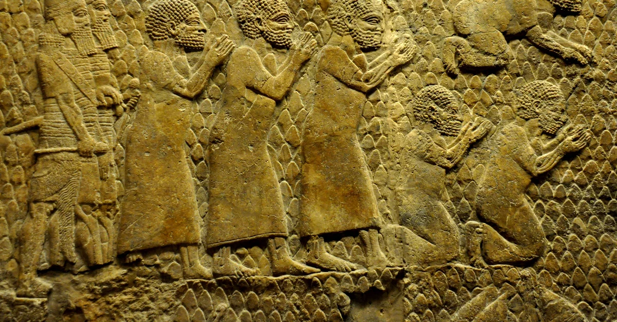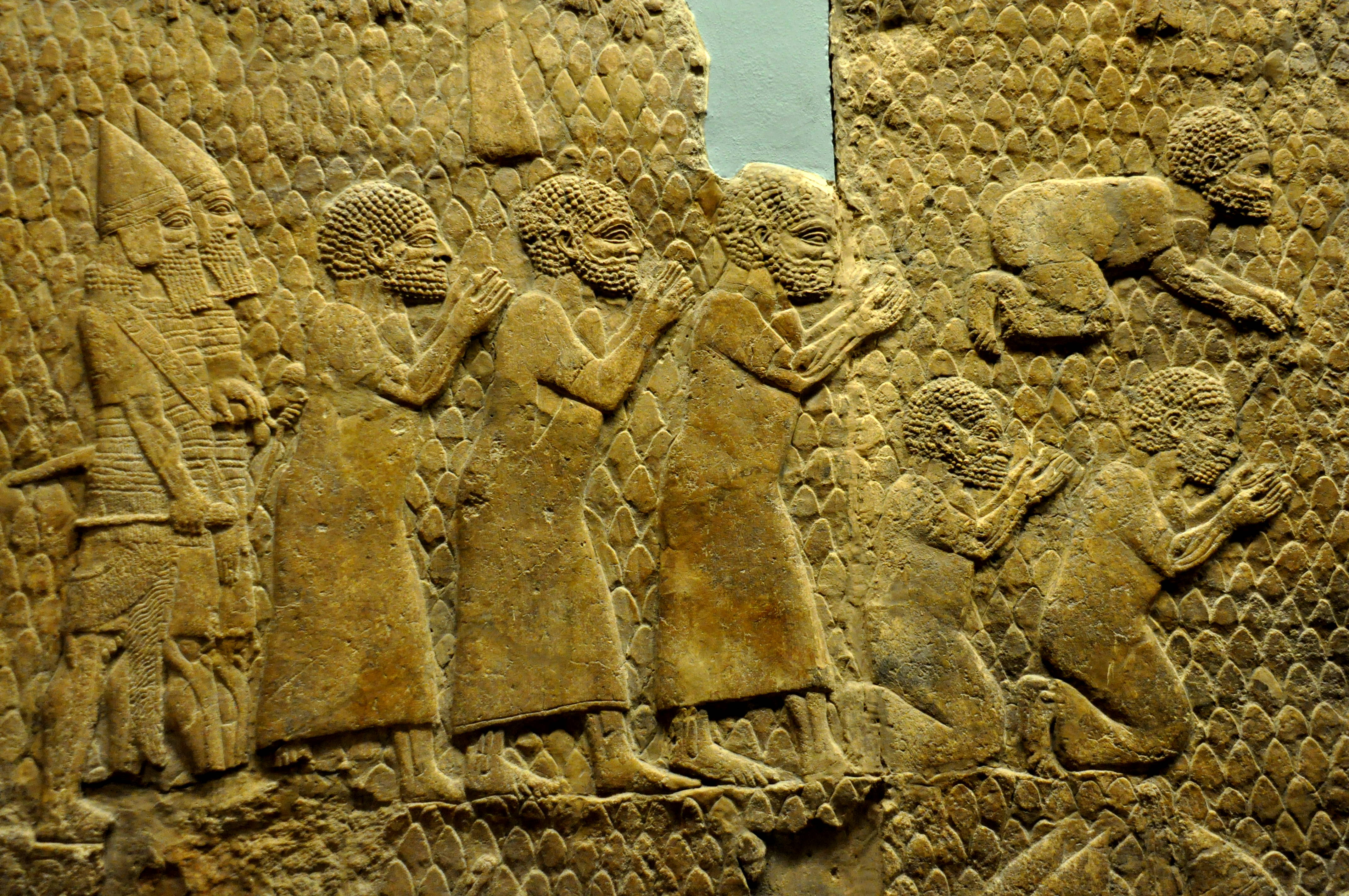 This wall relief depicts the procession of prisoners after the capture of Lachish by the Assyrian army. Two Assyrian soldiers guide the prisoners from behind and some of the prisoners kneel before the Assyrian king (who is not shown in this image). The prisoners most likely represent Lachish's officials, as some of them were slaughtered. From the South-West palace at Nineveh (modern Kuyunjik, Mousil city, Iraq), room XXXVI, panels 11-13. Mesopotamia, Neo-Assyrian era, 700-692 BCE. (The British Museum, London).