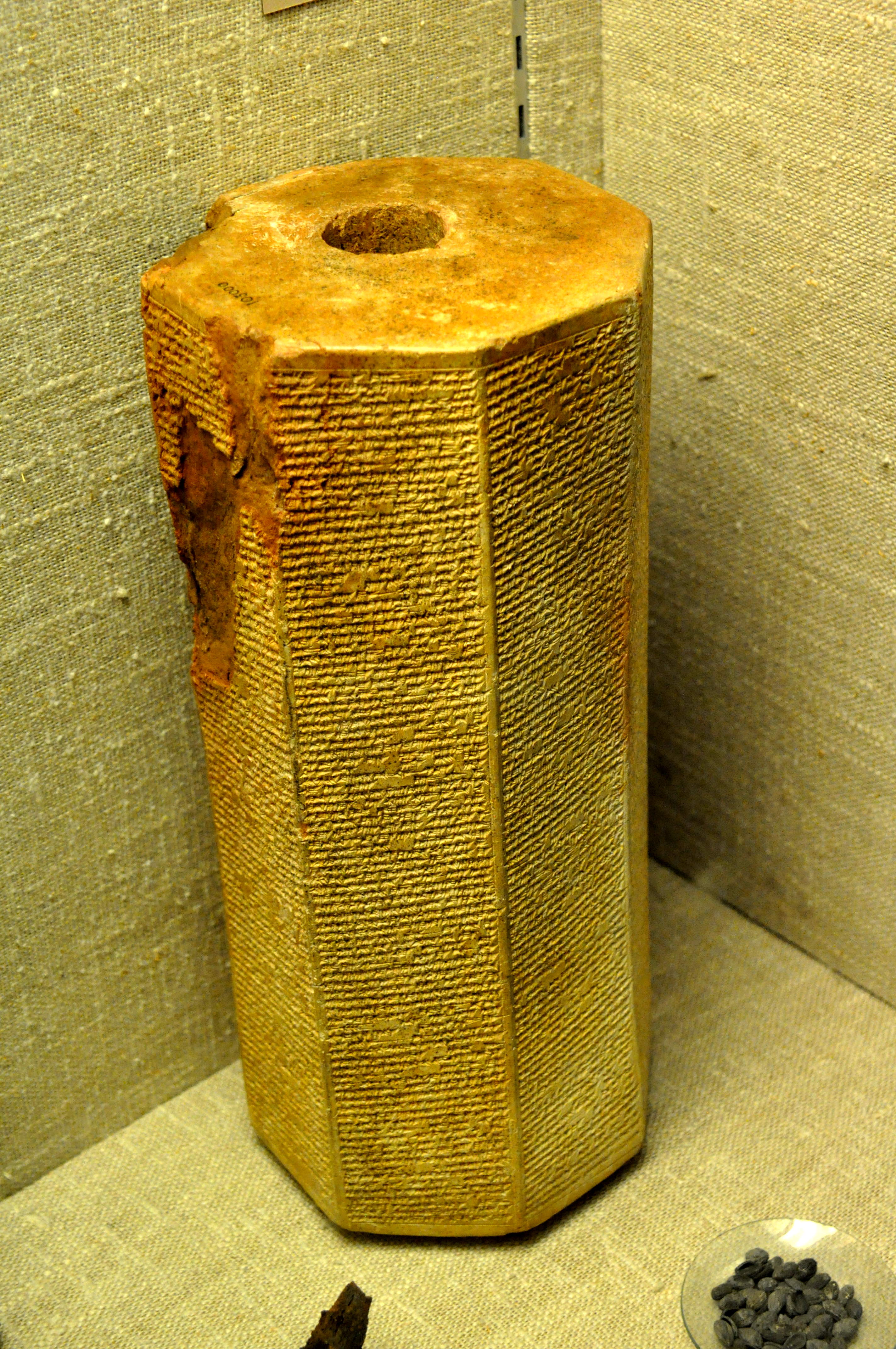 This terracotta prism was found in Nineveh. It documents Sennacherib's military campaigns and the rebuilding of the city of Nineveh. The siege and the capture of Lachish and Jerusalem occurred during his 3rd military campaign in 701 BCE. Details of the account of the siege are given in column iii, lines 38-81. From Nineveh (modern Kuyunjik, Mousil city, Iraq), Mesopotamia. Neo-Assyrian era, 694 BCE. (The British Museum, London).