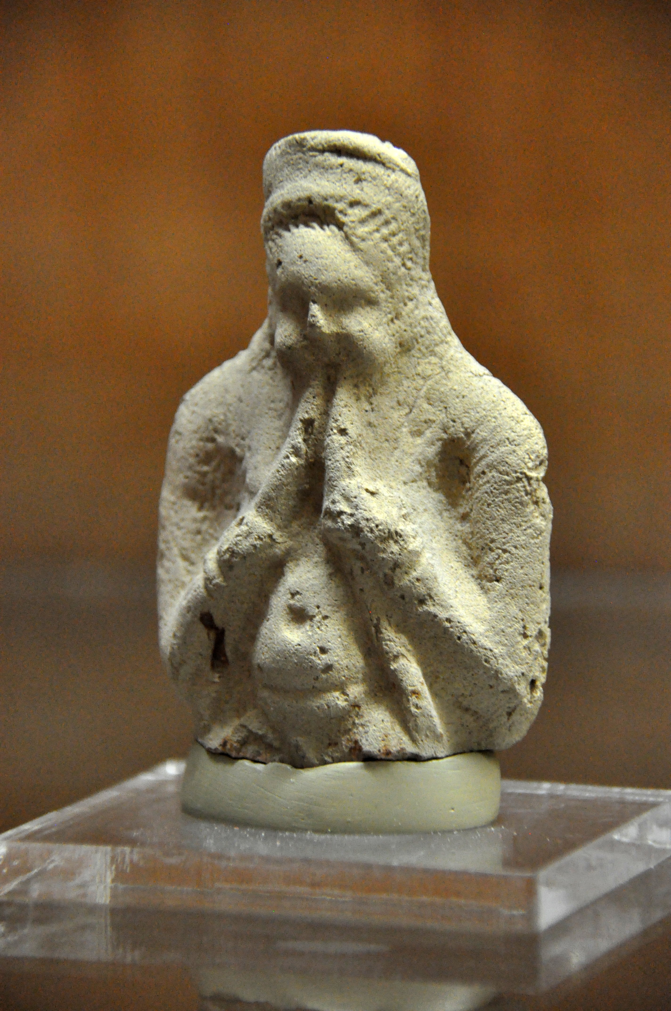 This is the upper part of a terracotta statue that depicts a musician who appears to play on two flute-like instruments. The Hellenistic period, 323-30 BCE. From Mesopotamia, Iraq. (The Sulaimaniya Museum, Iraq).